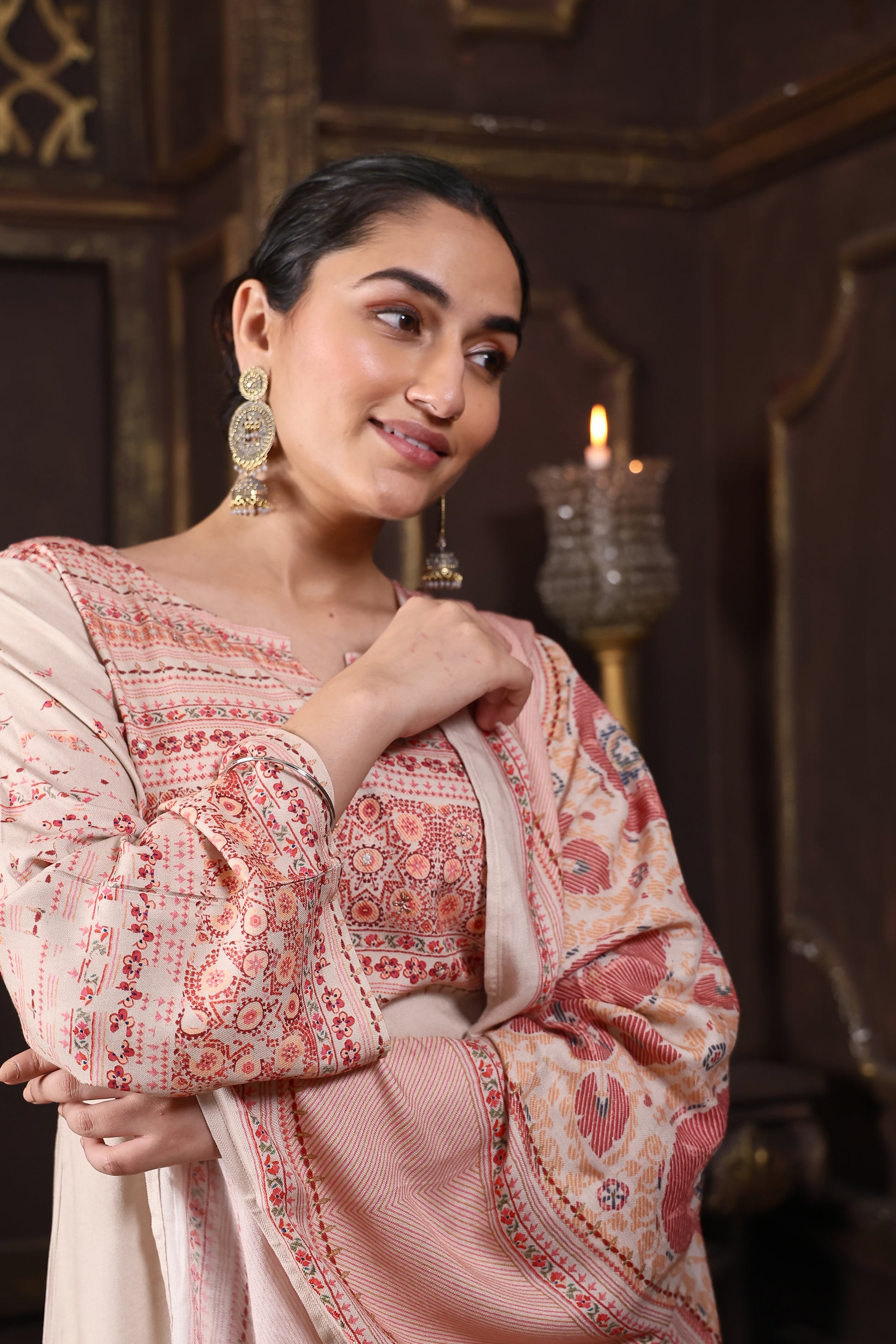 This elegant viscos pashmina suit set features a beautifully printed top with false mirror work detailing on the front for a touch of glamour. The top's printed sleeves complement the design, while the straight pant offers a modern fit. The dupatta, fully printed, adds to the ensemble's graceful appeal. Made from soft and luxurious pashmina fabric, this set is perfect for both casual and semi-formal occasions
