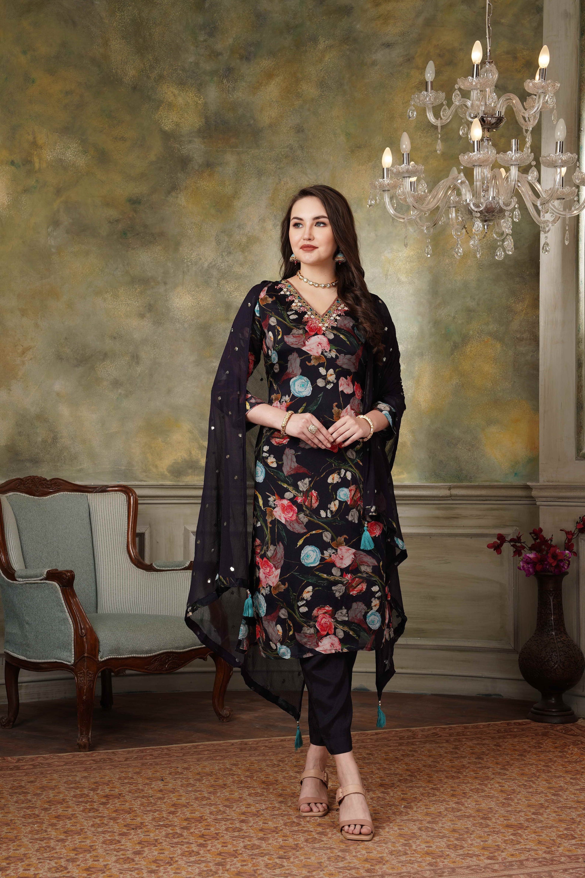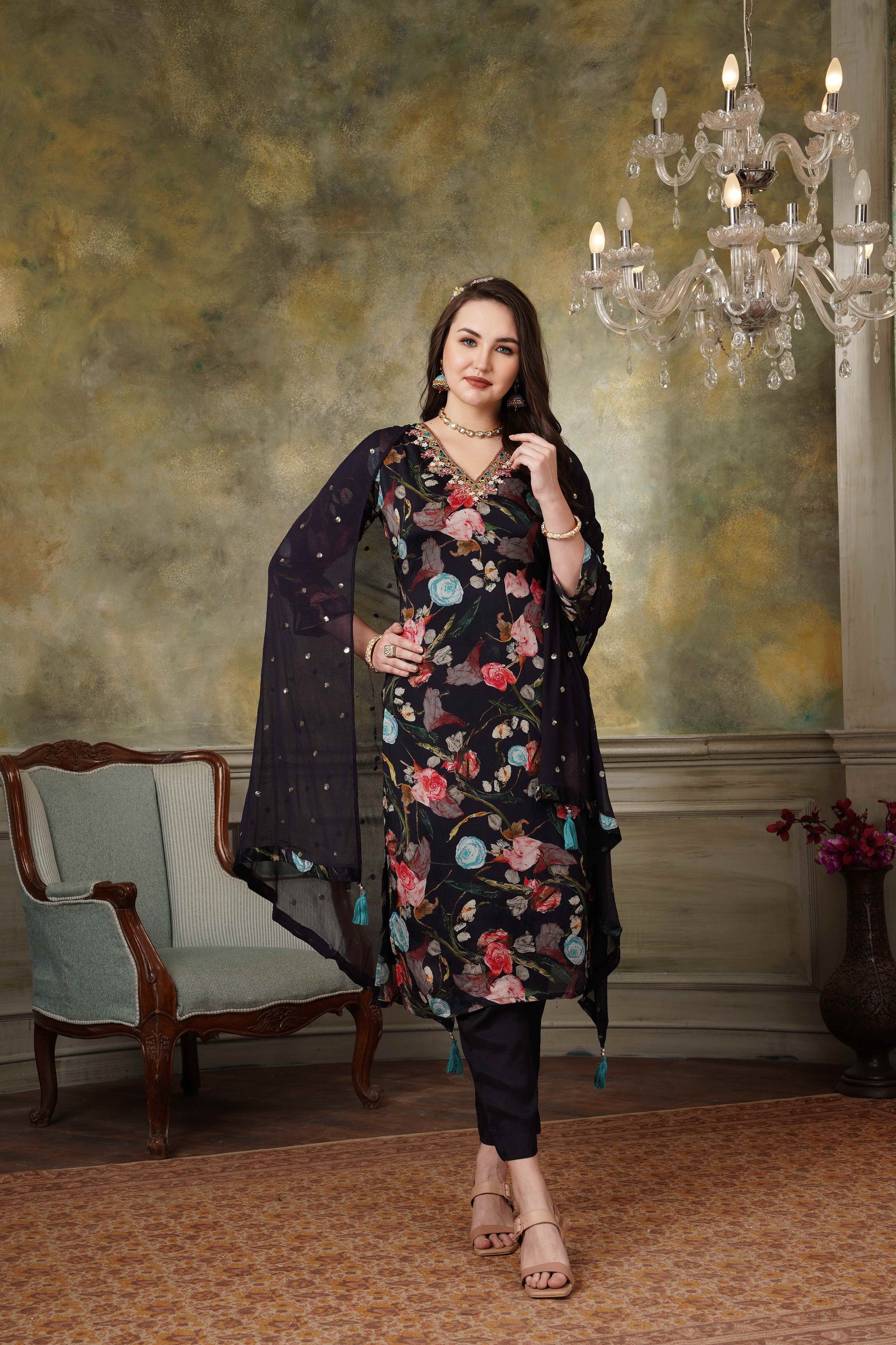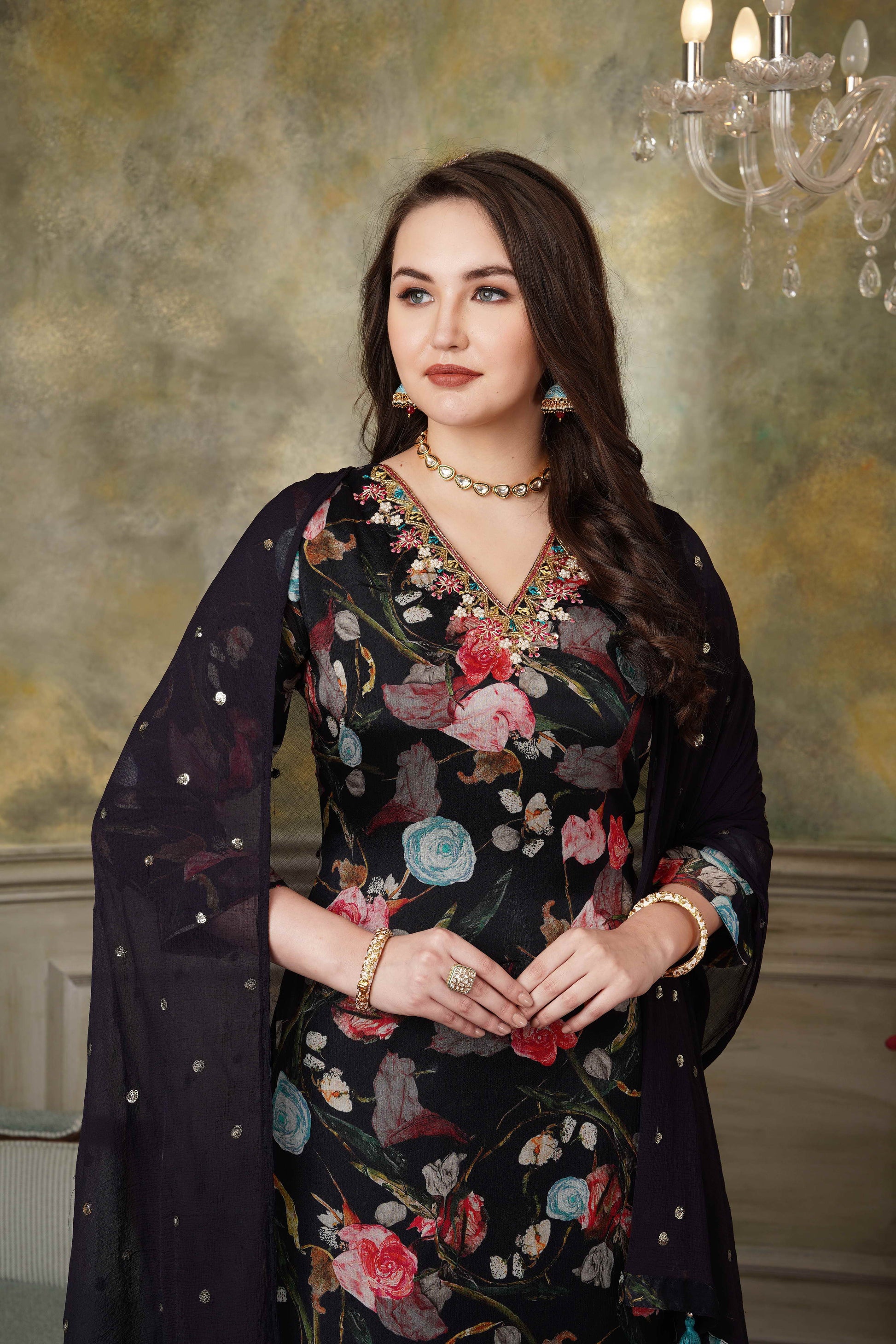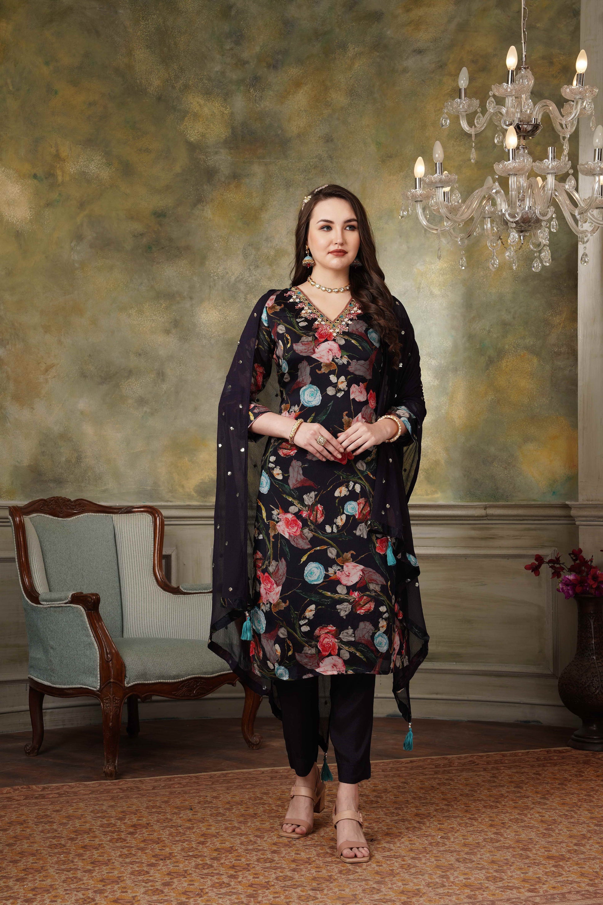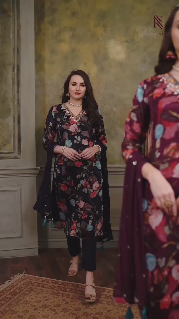Black Floral Pure Chinnon Suit Set #1341
