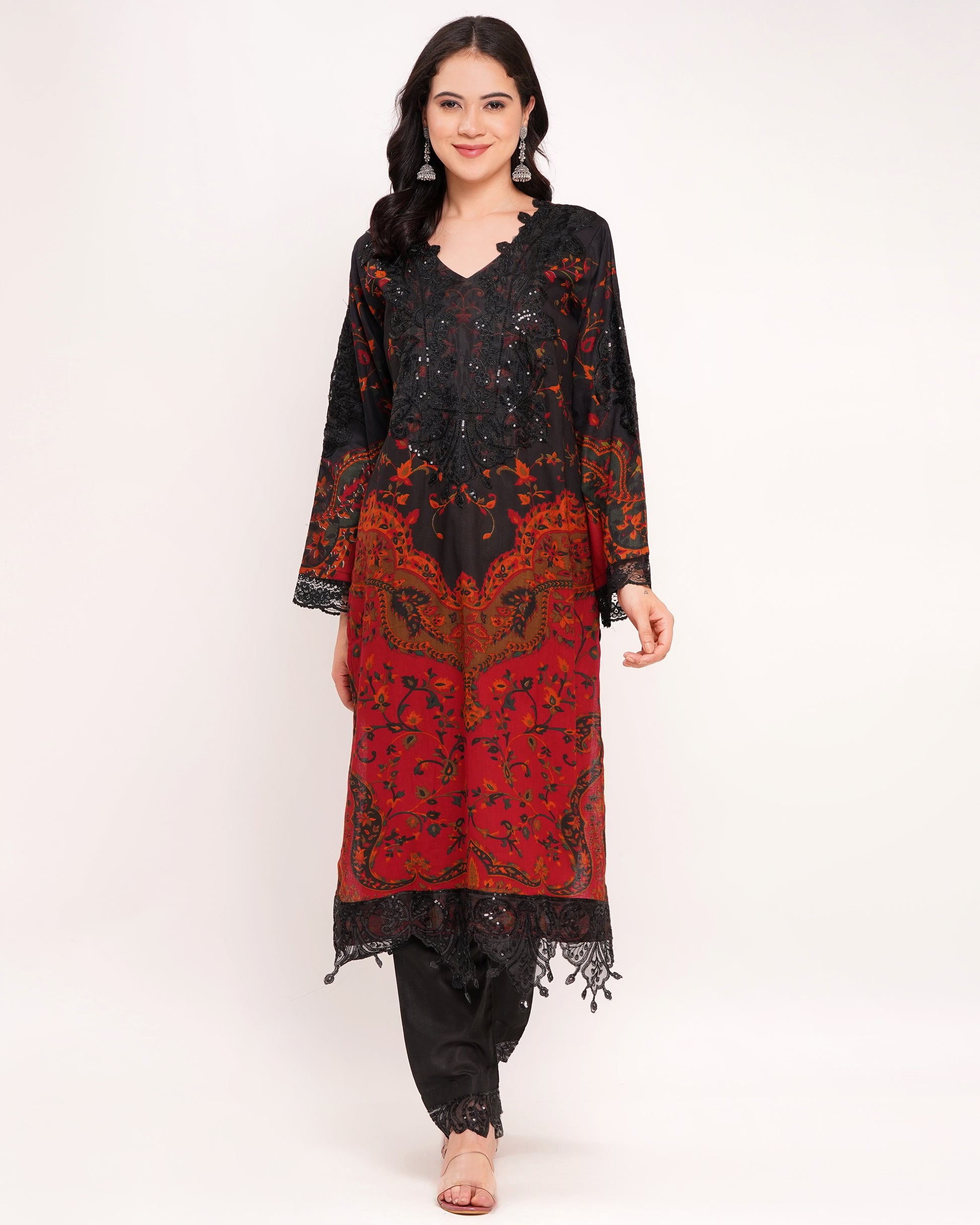 Add a timeless touch of elegance to your wardrobe with this stunning Black & Maroon Pakistani Lawn Cotton Suit Set. Crafted for the modern woman who adores tradition, this ensemble blends intricate design with breathable comfort. The kurta features a rich contrast of floral maroon prints against a deep black base, elevated with delicate organza patches and lace detailing on the sleeves and hemline.