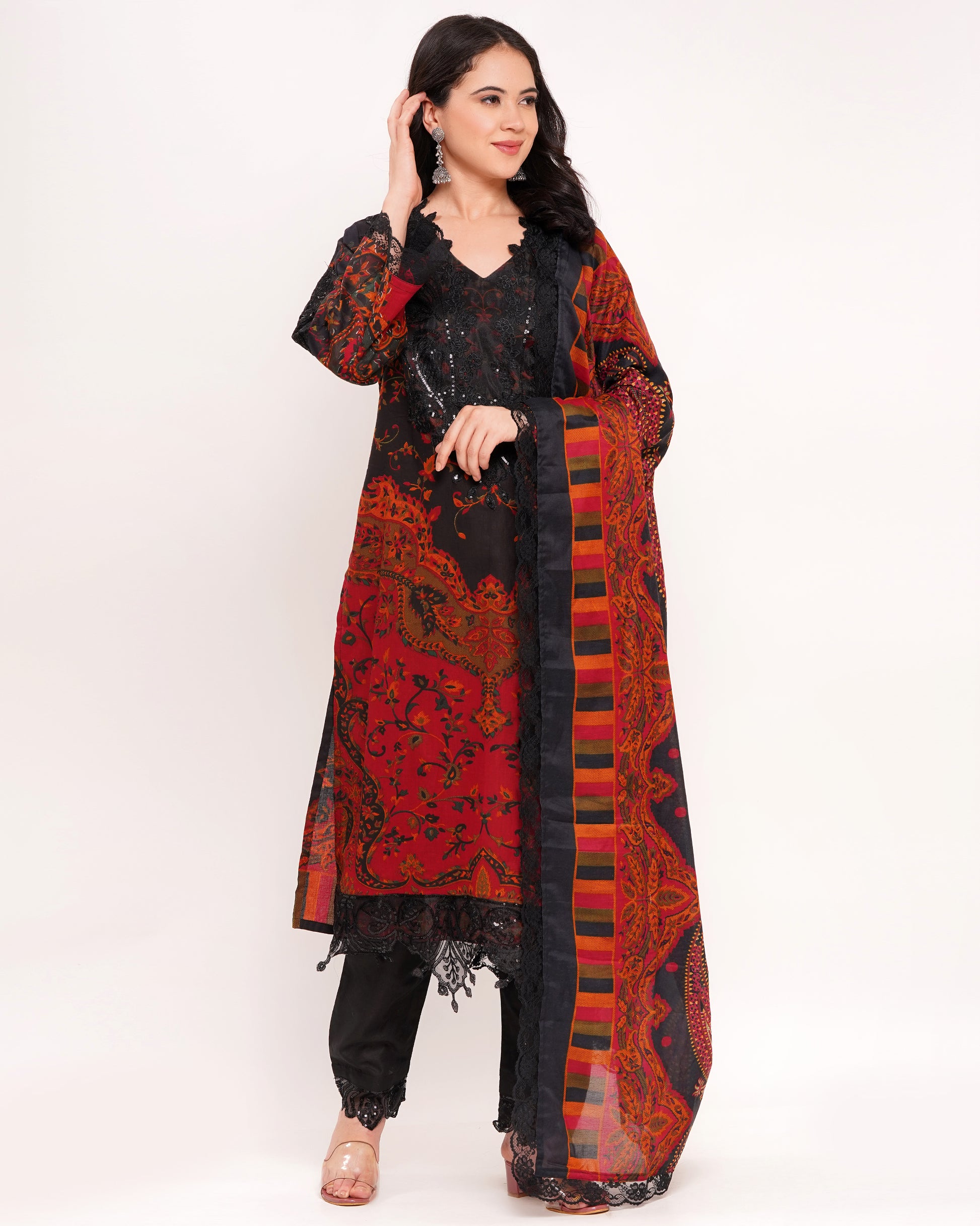 Pakistani cotton suit set, Lawn cotton Pakistani suit, Organza patchwork suit, Lace detailing kurta, Party wear ethnic suit, Festive suit for women, Maroon and black salwar suit, Eid special suit set, Designer Pakistani suit online, Printed dupatta ethnic set