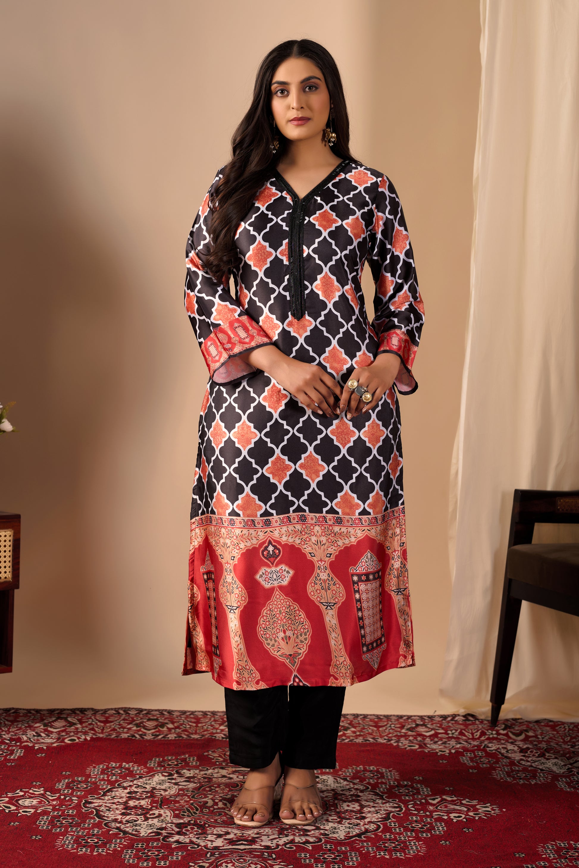 Elegant, chic, and timeless — this black and red satin kurta set is a perfect blend of modern geometry and ethnic charm. Made from premium satin fabric with a soft inner lining in both the top and bottom, it ensures luxurious comfort throughout the day. The geometric trellis pattern on the body beautifully contrasts with the intricate ethnic border design, making it a standout piece for any occasion.