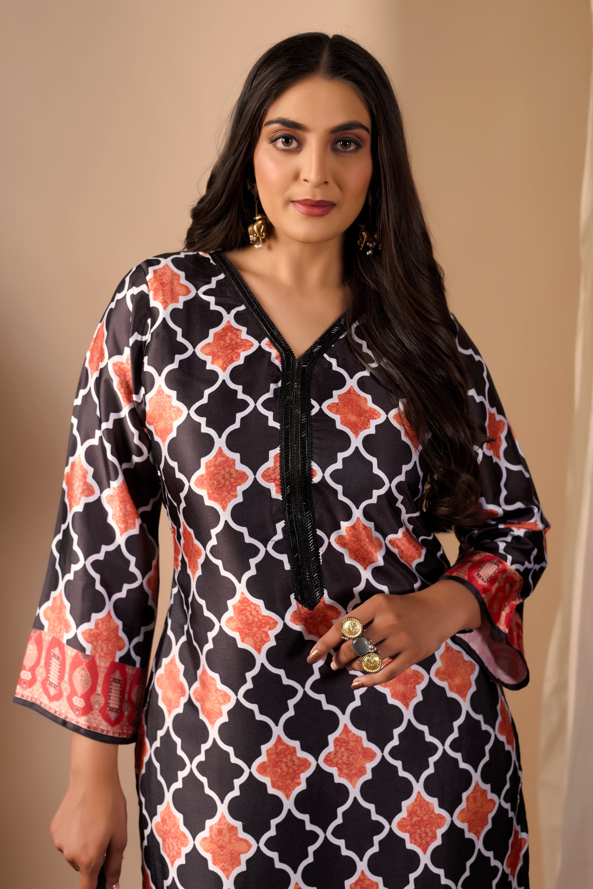 Black & Orange Geometric Print Pure Satin Kurta Set #1897