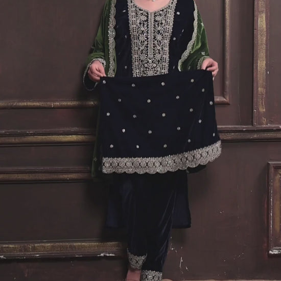 A luxurious velvet suit set ideal for parties, featuring intricate zari embroidery on the top, daman, and pant hem. The velvet dupatta, with all-over zari embroidery, adds a rich, cohesive elegance to the ensemble.
