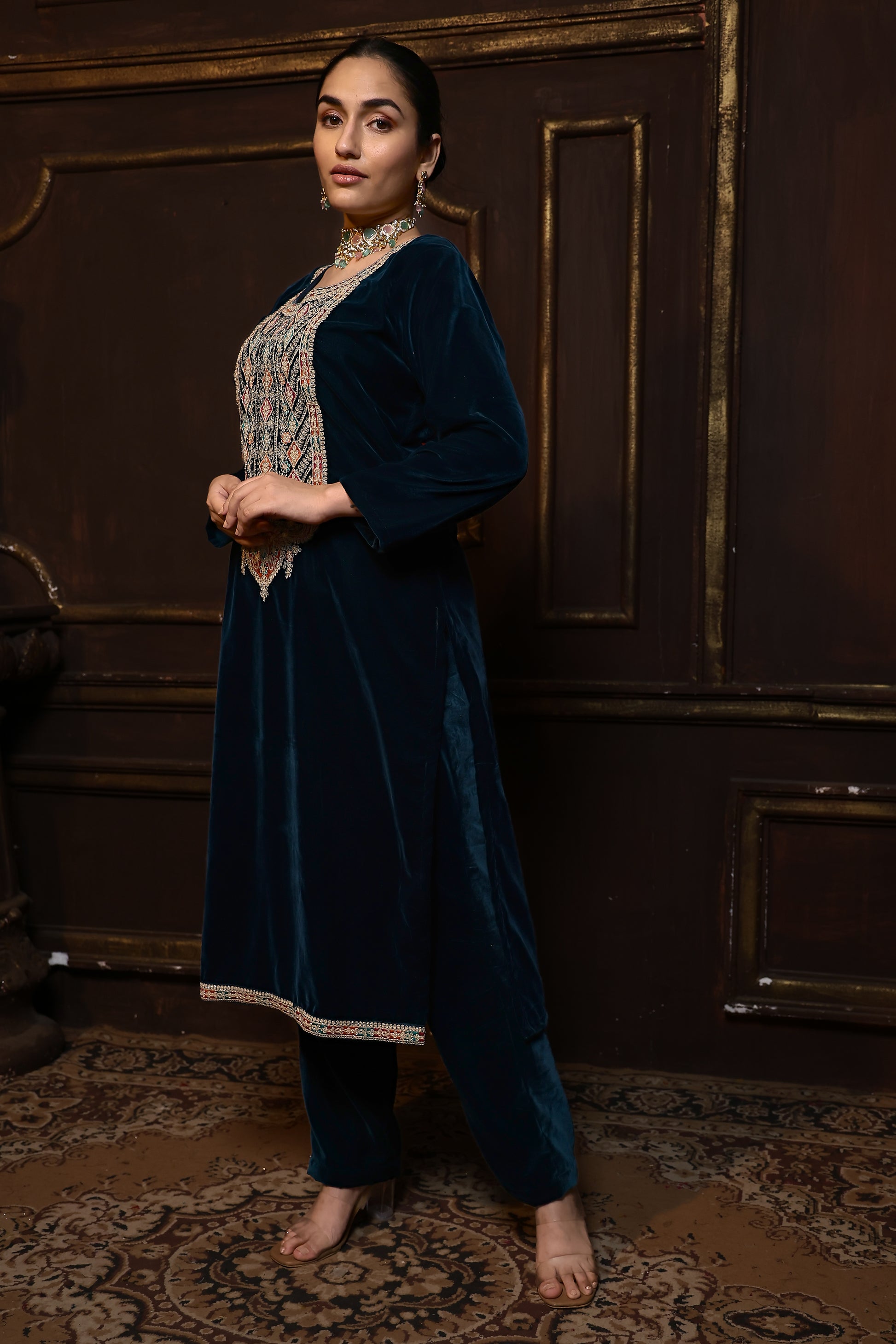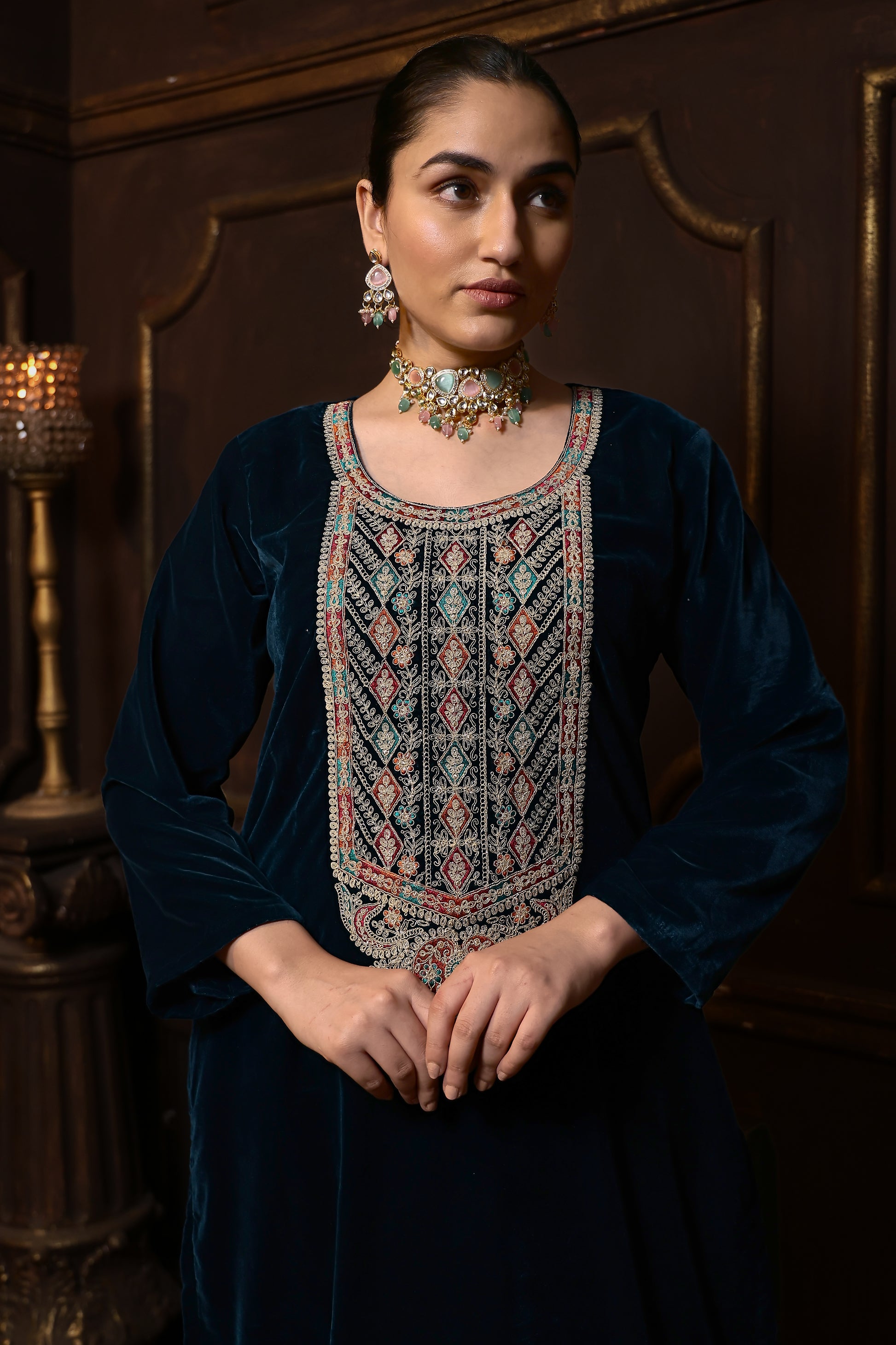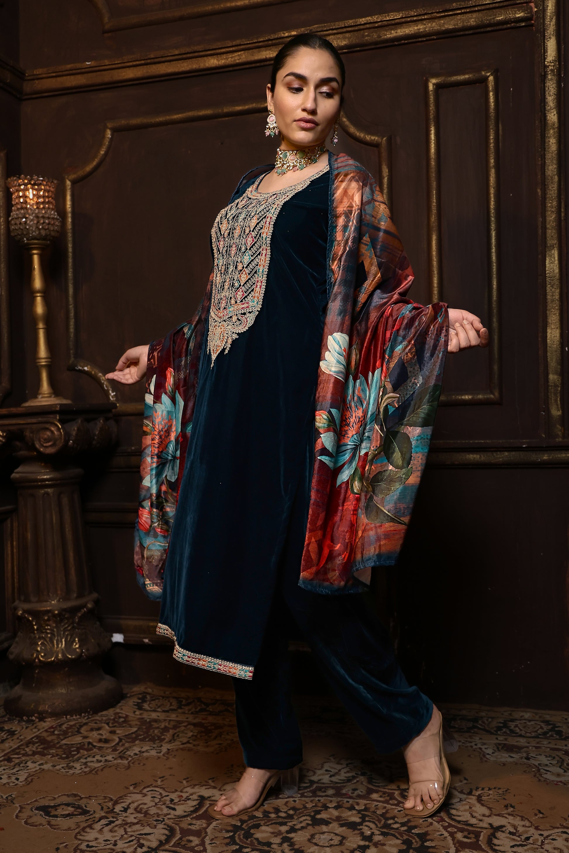 This elegant velvet suit set, perfect for winter and party wear, features a rich velvet top, bottom, and dupatta. The top showcases intricate zari thread work on the yoke, adding a touch of sophistication. The bottom is designed as straight pants for a modern look, and the floral-printed velvet dupatta enhances the ensemble’s luxurious feel.