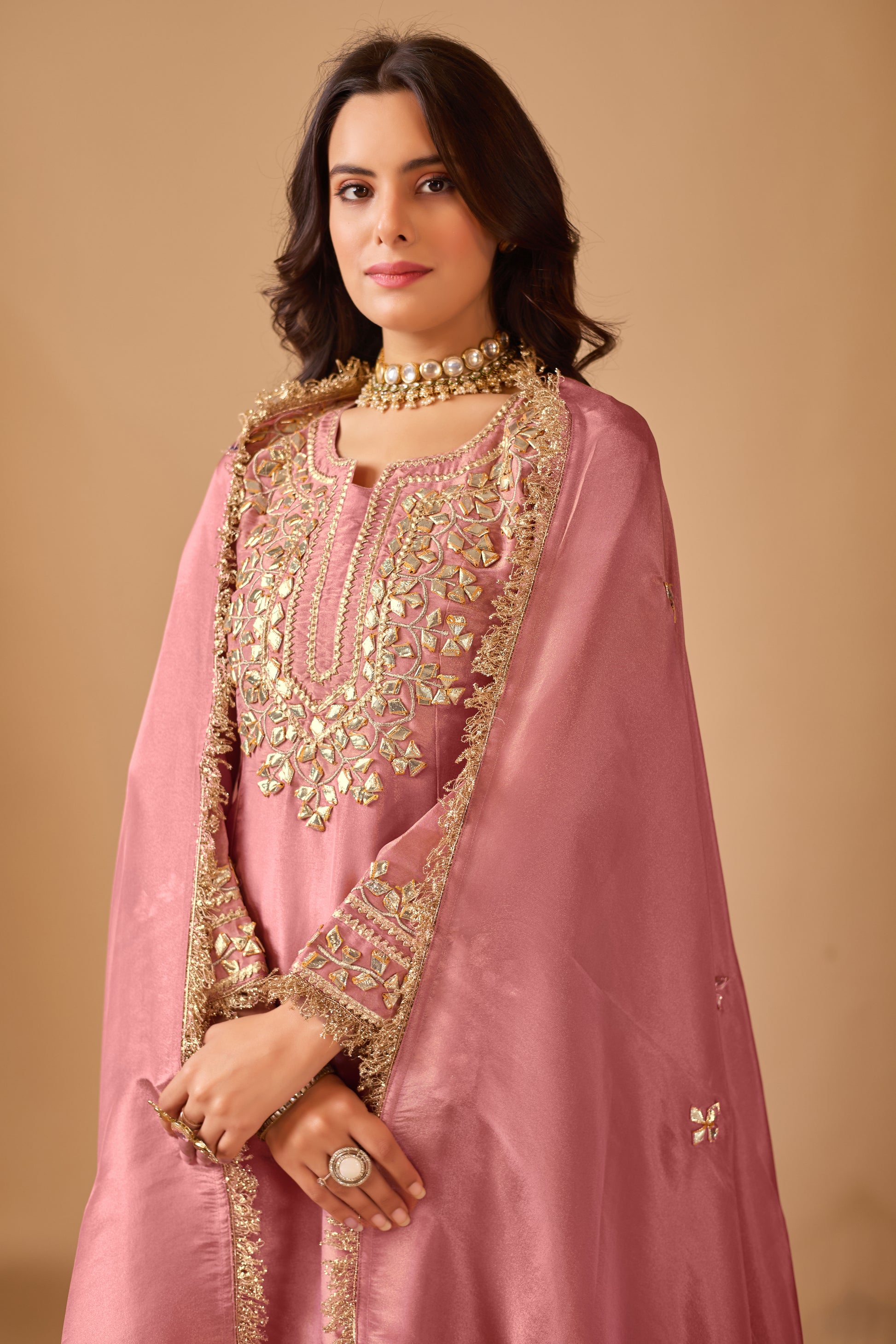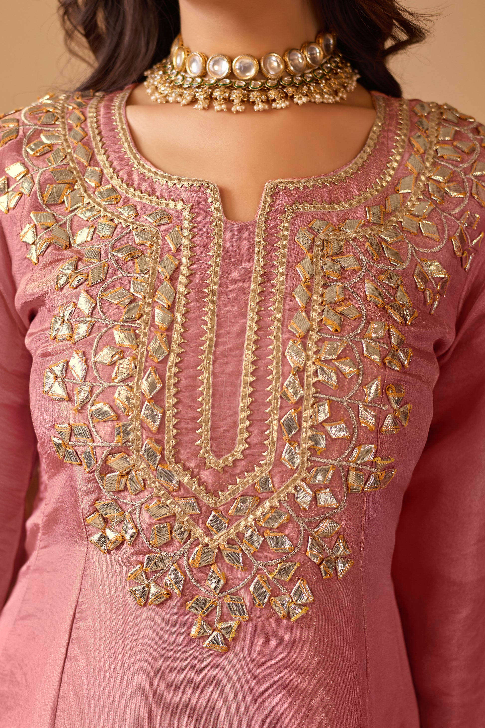 Drape yourself in timeless elegance with our Rose Luxe Anarkali Set, crafted in pure Tissue Shimmer Silk that exudes a soft rose-gold glow. The ensemble features intricate gotta handwork along the neckline, sleeves, and borders — adding a regal sparkle to its graceful silhouette. The Anarkali-style kurta and coordinated pure muslin salwar come with full lining for ultimate comfort and structure, while the matching dupatta completes the look with subtle embellishments and a delicate fringe border.