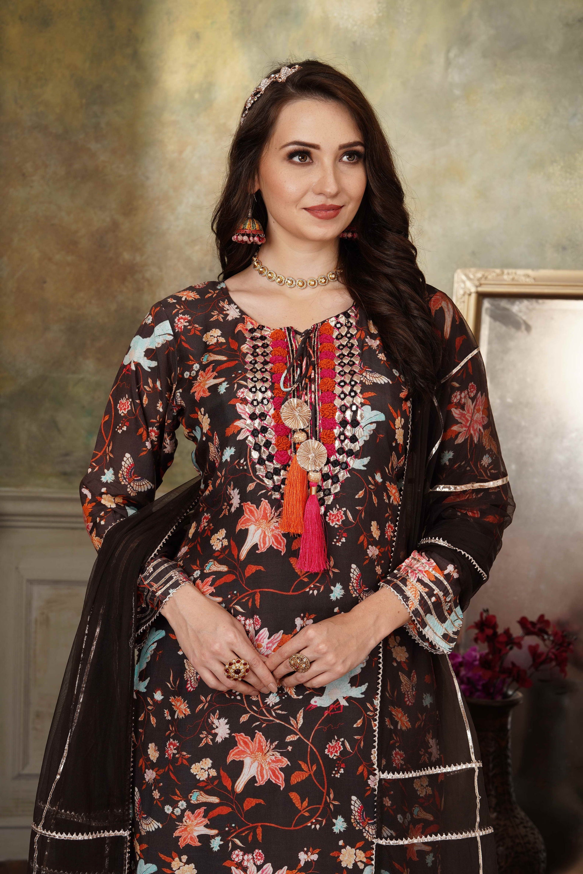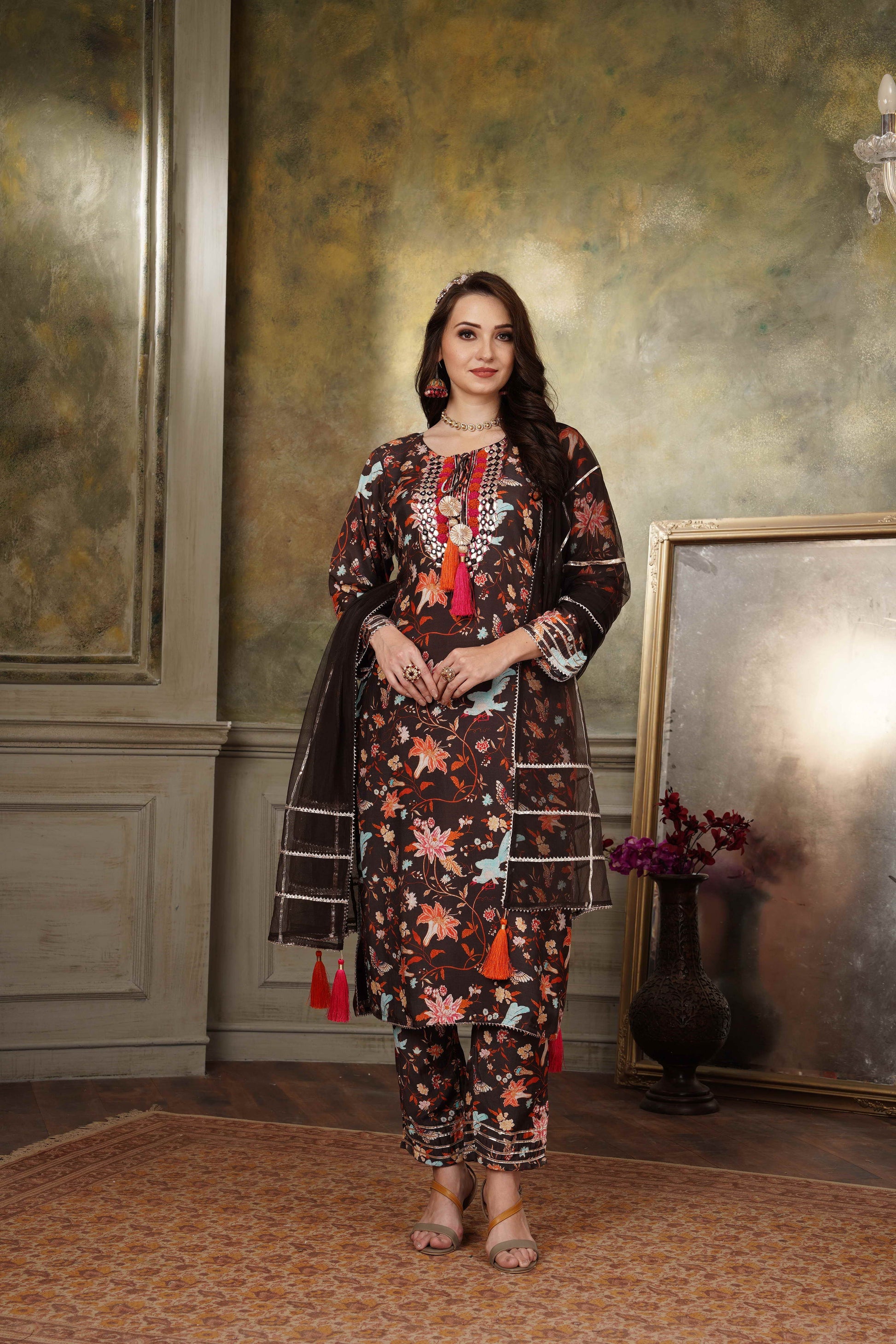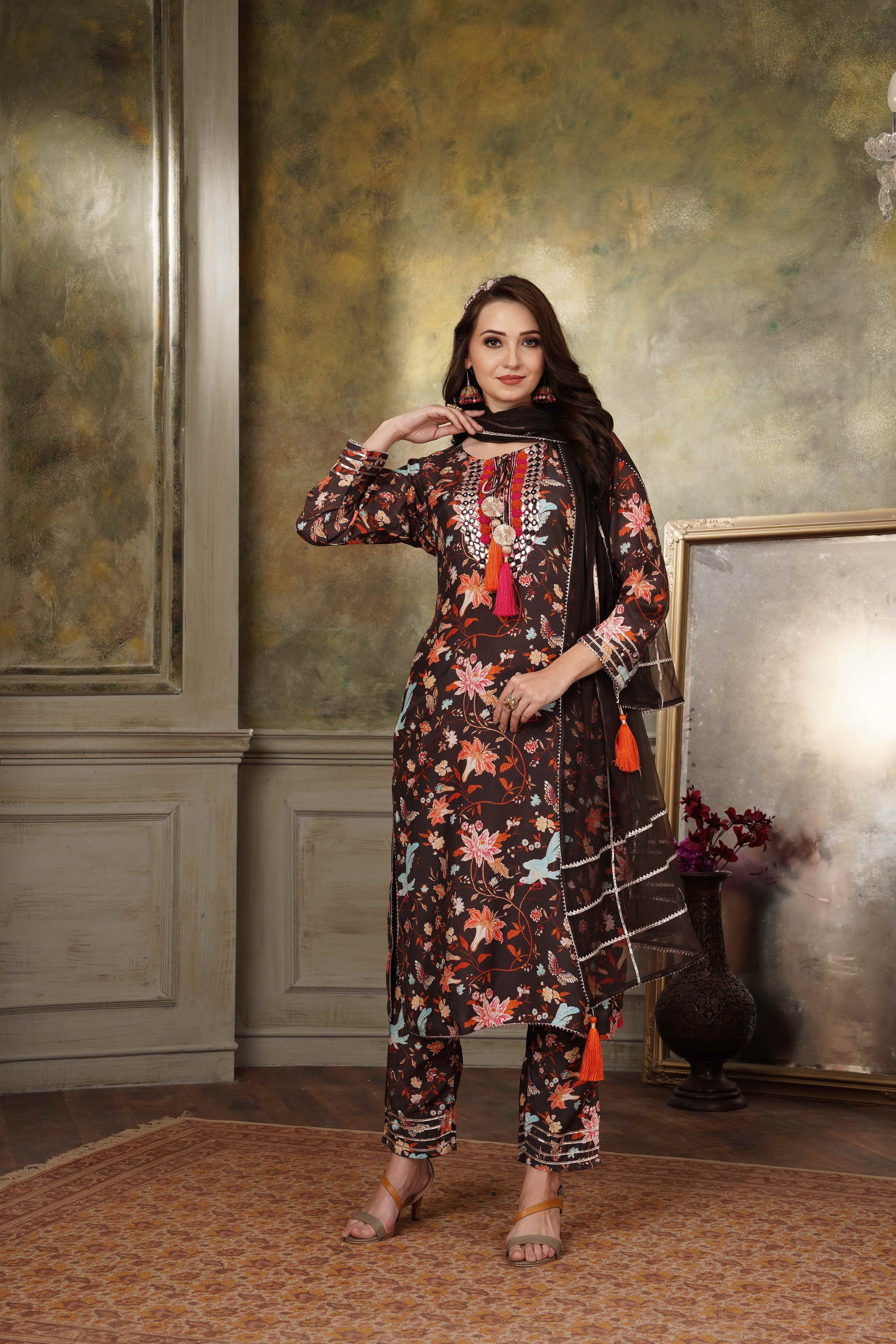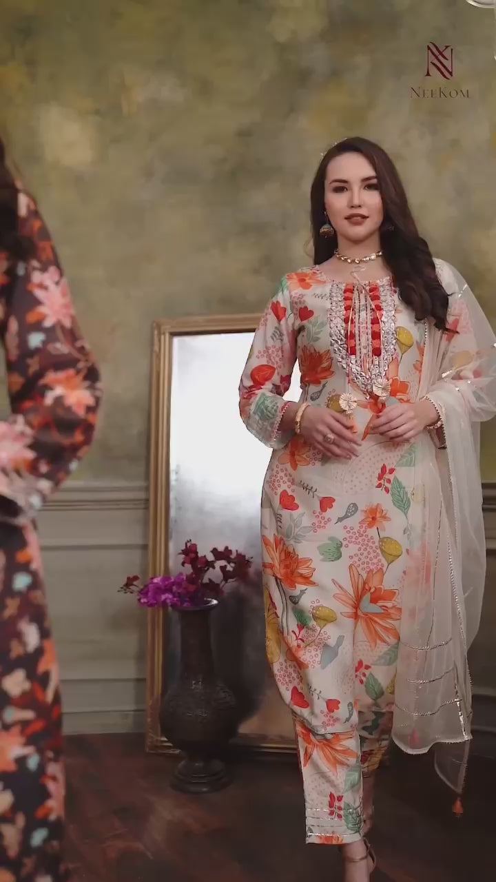 Pure Muslin suit paired with soft net dupatta. Includes lining in top & bottom.
