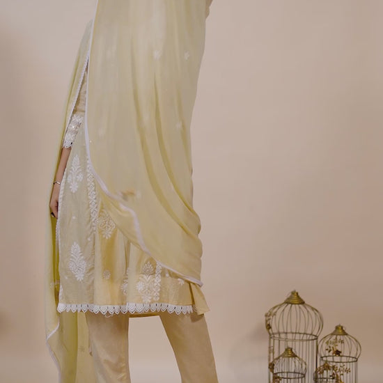 Step into timeless grace with this exquisite Chikankari suit set crafted in premium Dobby Mal Cotton. The outfit features intricate embroidered Chikankari motifs, delicately placed across the yoke, sleeves, and hemline. The flared kurta is paired with straight pants and a soft mal dupatta detailed with lace edging for a refined touch.
