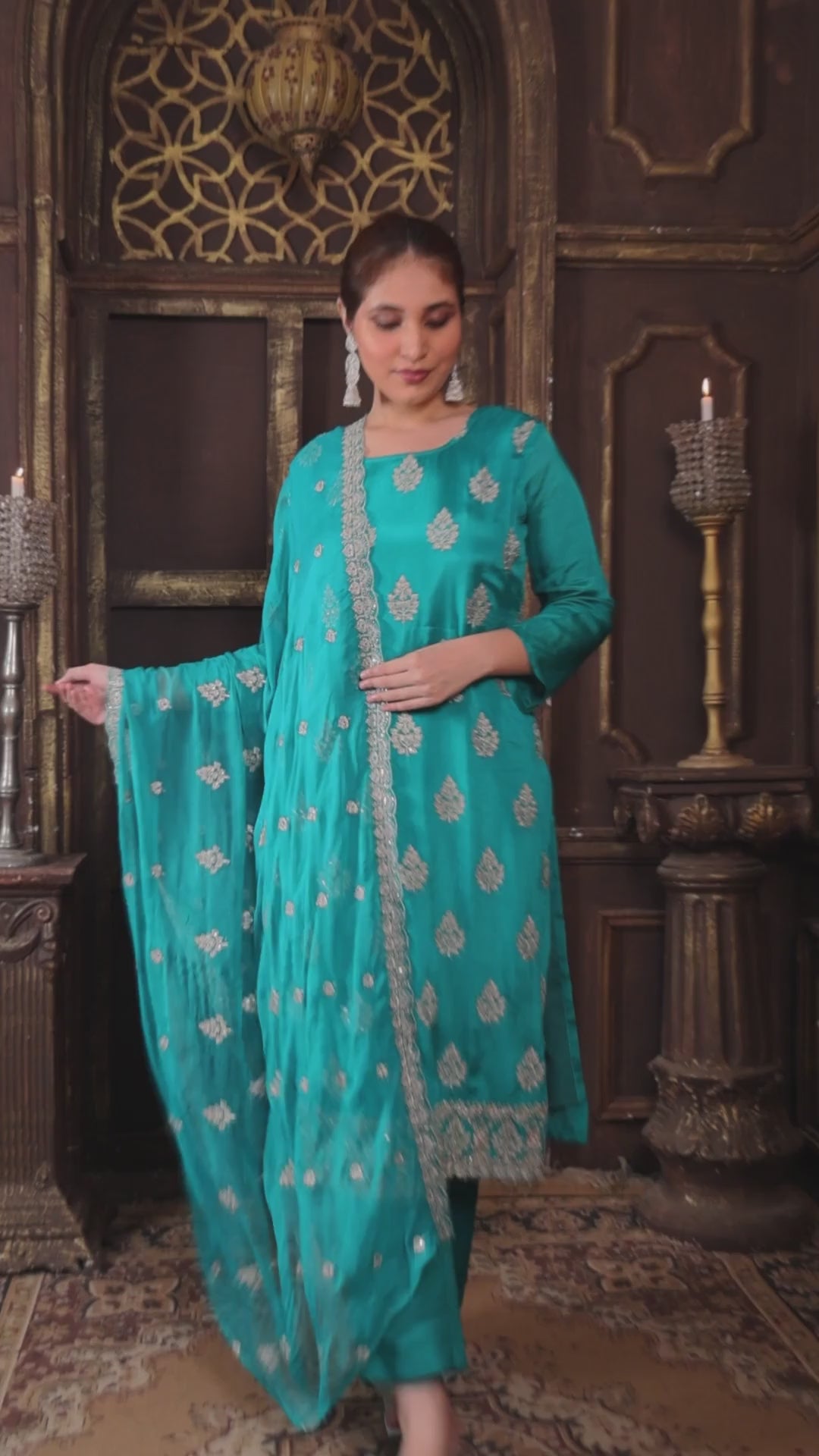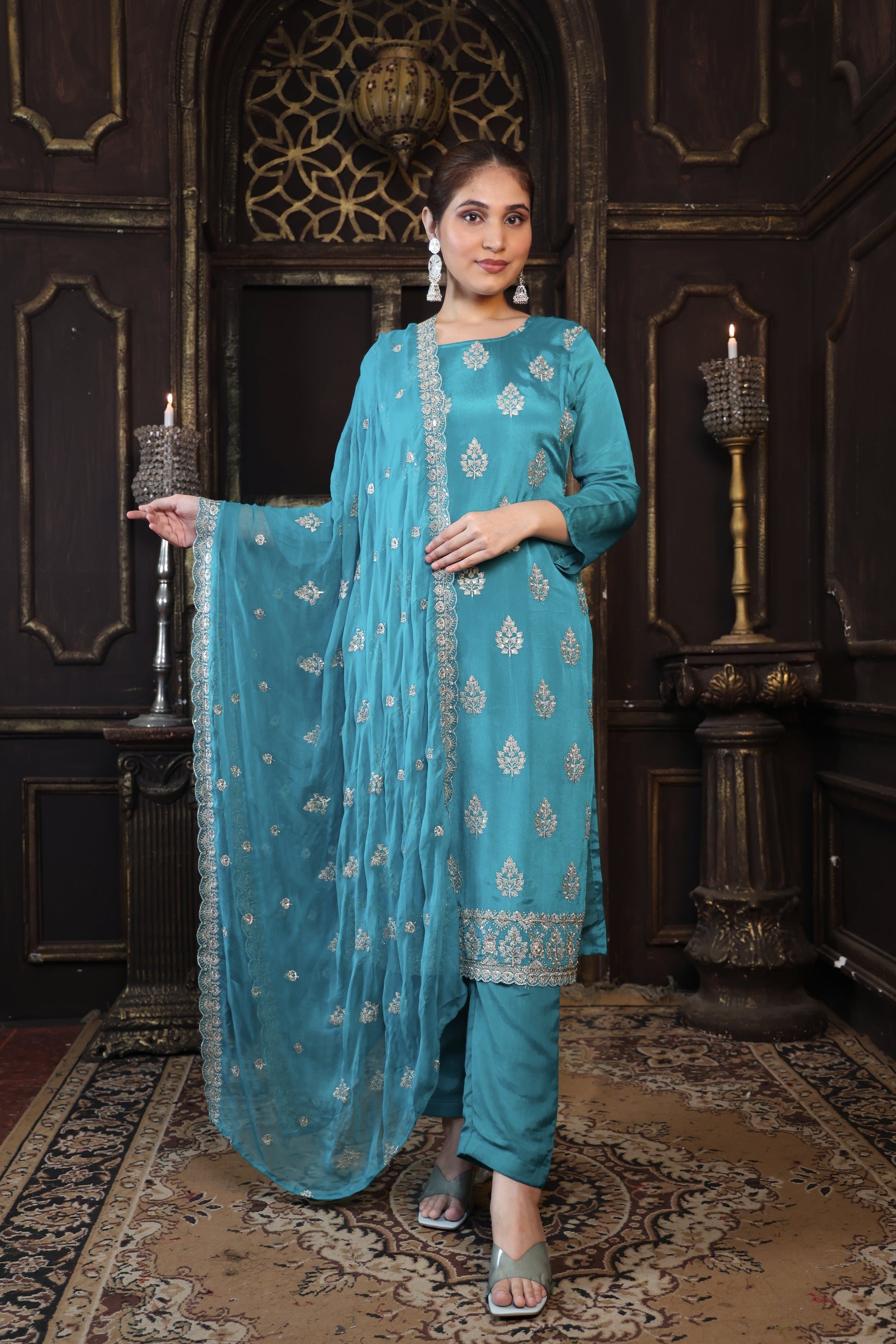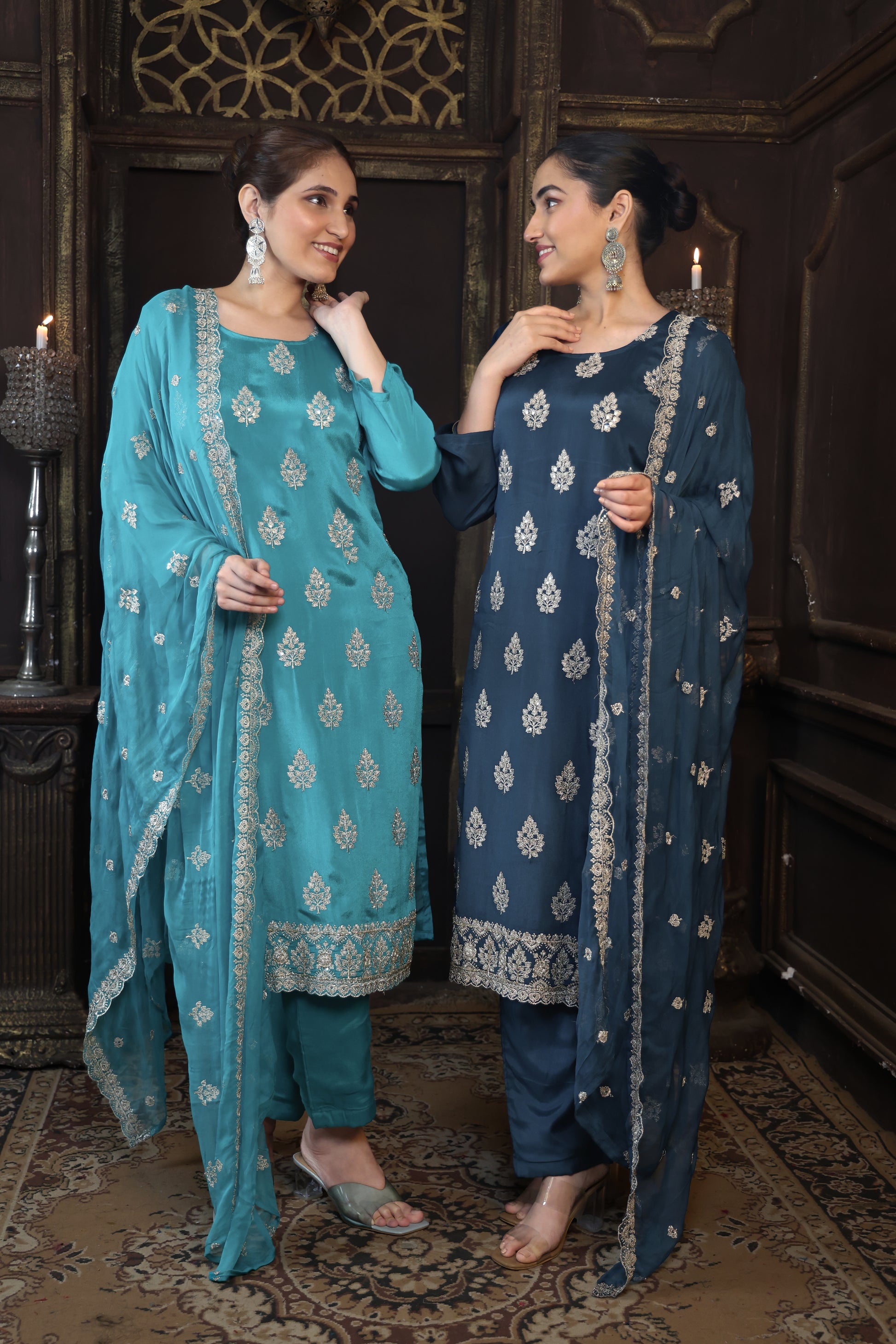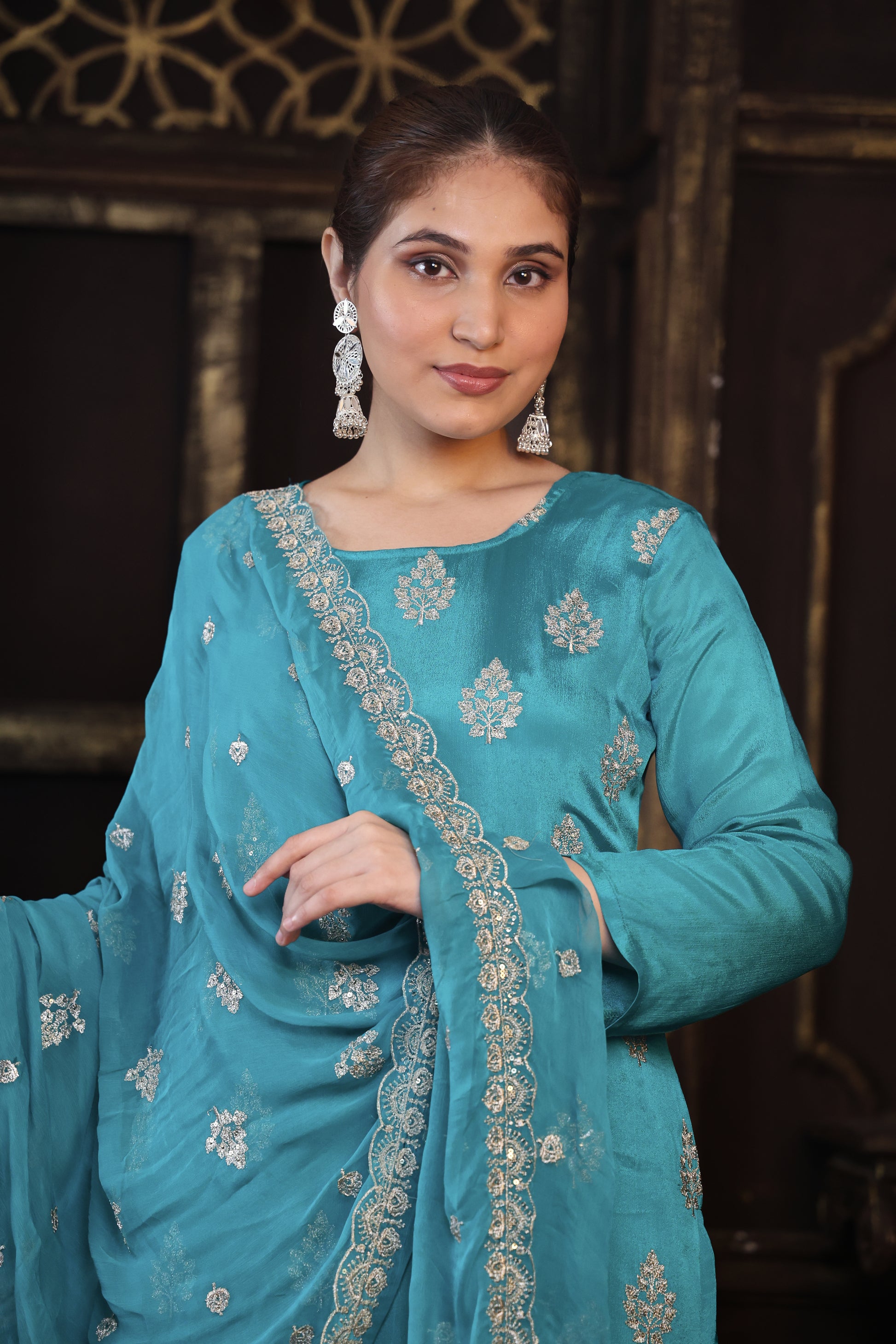 This elegant set features a Chinon top with intricate zari thread and sequin work, a fully embellished chiffon dupatta, and comfortable Shantoon straight pants. Perfect for parties, weddings, and festive occasions, it combines style and sophistication effortlessly.
