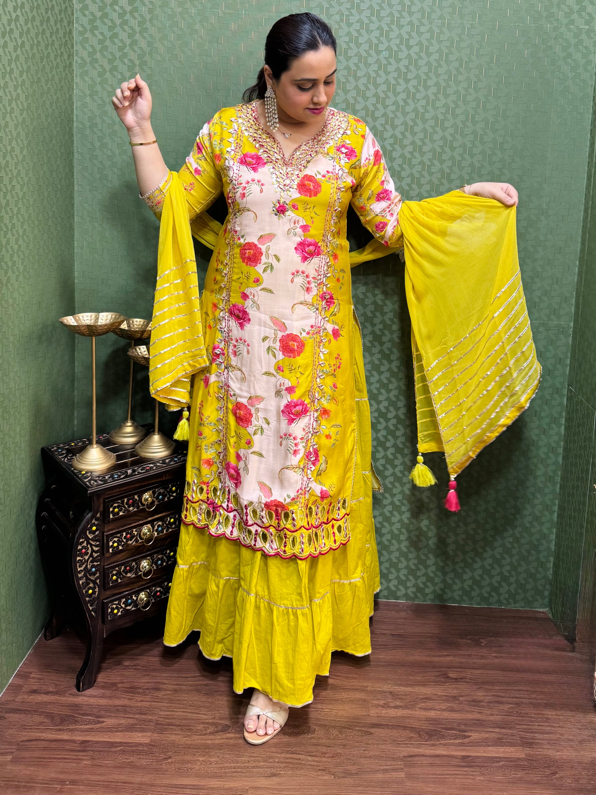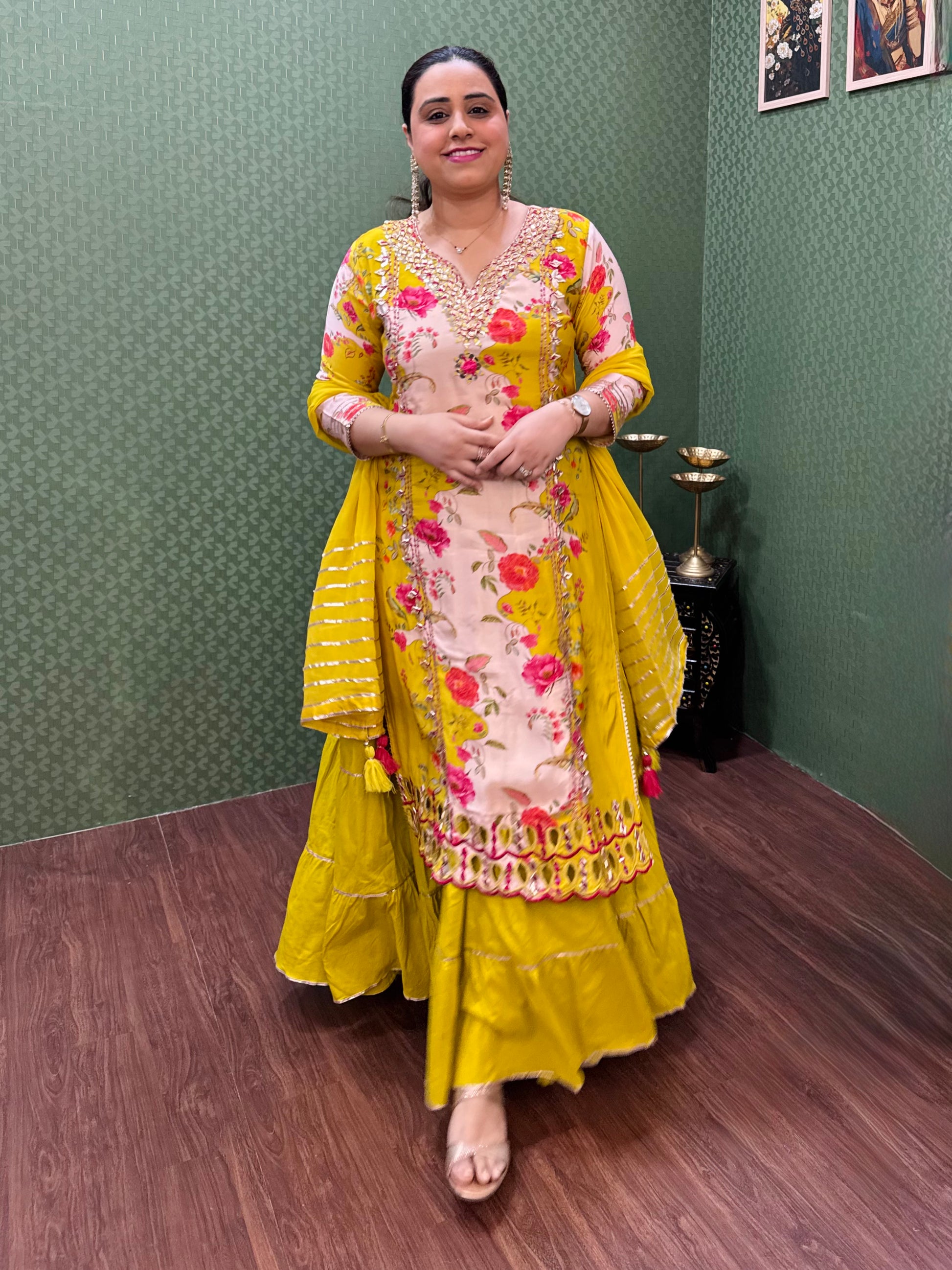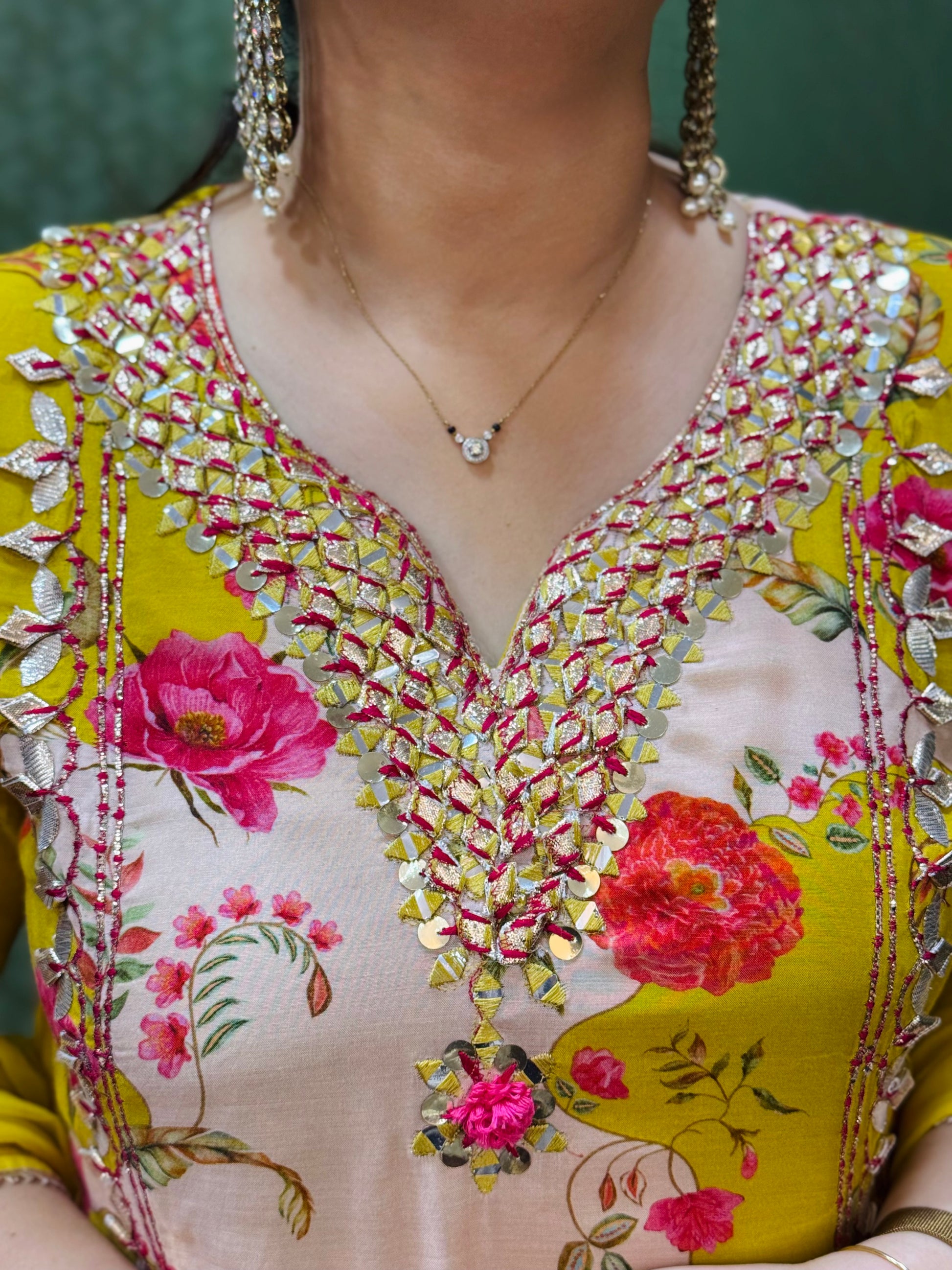 Make a graceful statement with this stunning Pure Muslin One-Piece Gown, crafted to perfection for a blend of tradition and elegance. The top, made of soft muslin, features intricate detailing of gotta work, showcasing exquisite craftsmanship. The bottom skirt, crafted from luxurious mul cotton, flows beautifully, offering a flattering silhouette. The attached skirt and top create a seamless, elegant look. Completing the ensemble is a lightweight chiffon dupatta, adorned with delicate gotta lace on all four sides, adding a touch of sophistication. Perfect for weddings, festive occasions, or special events.