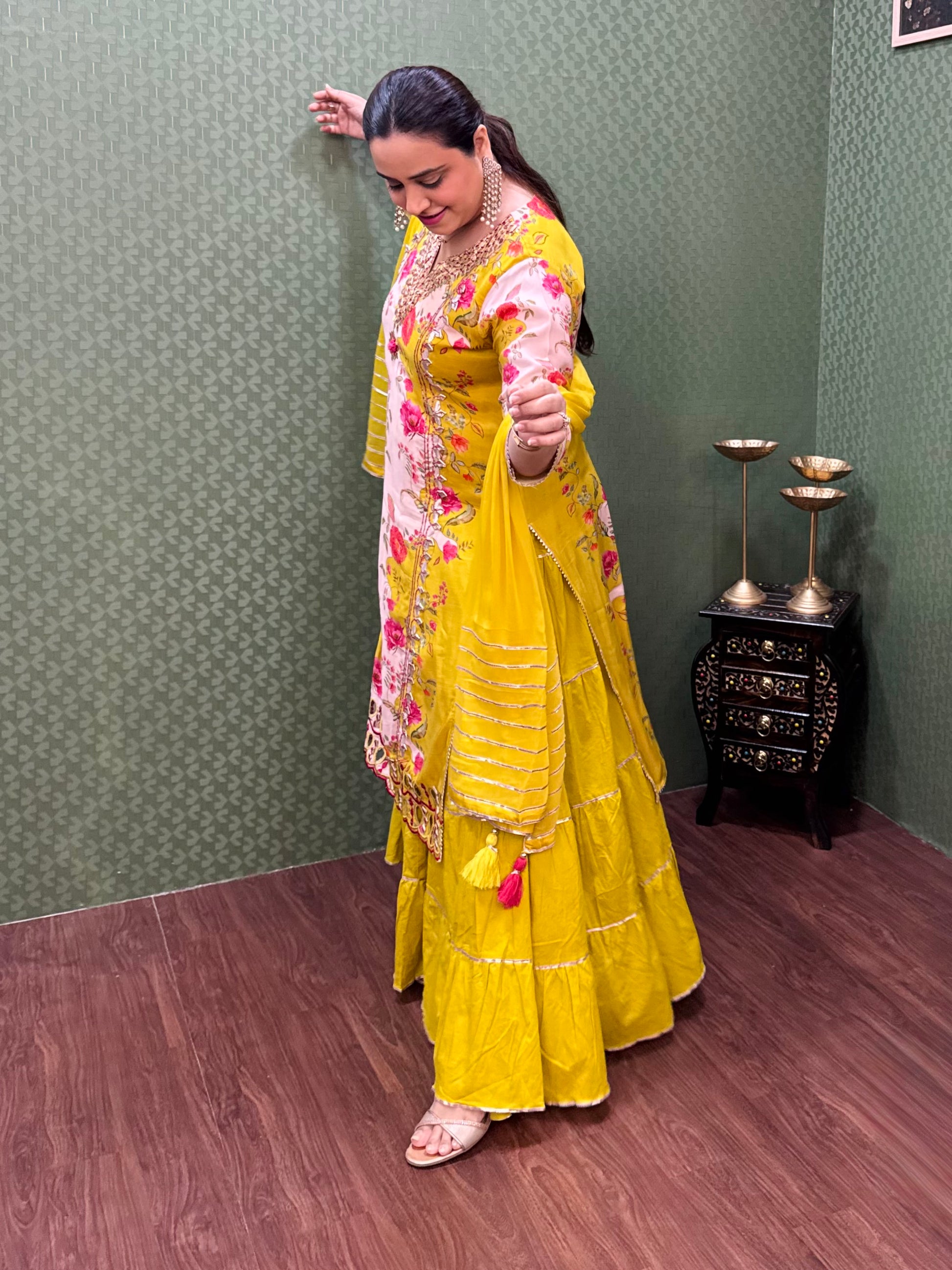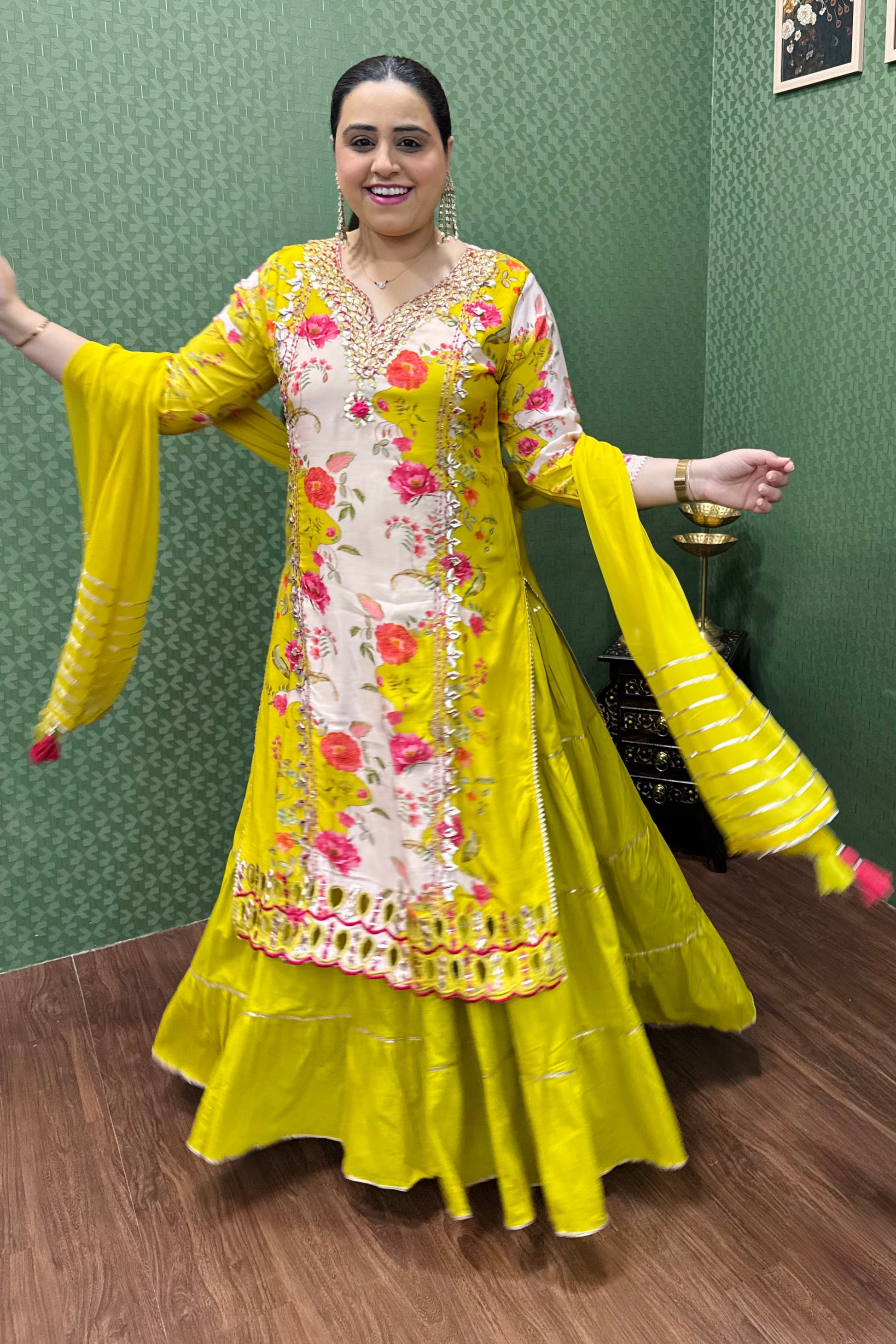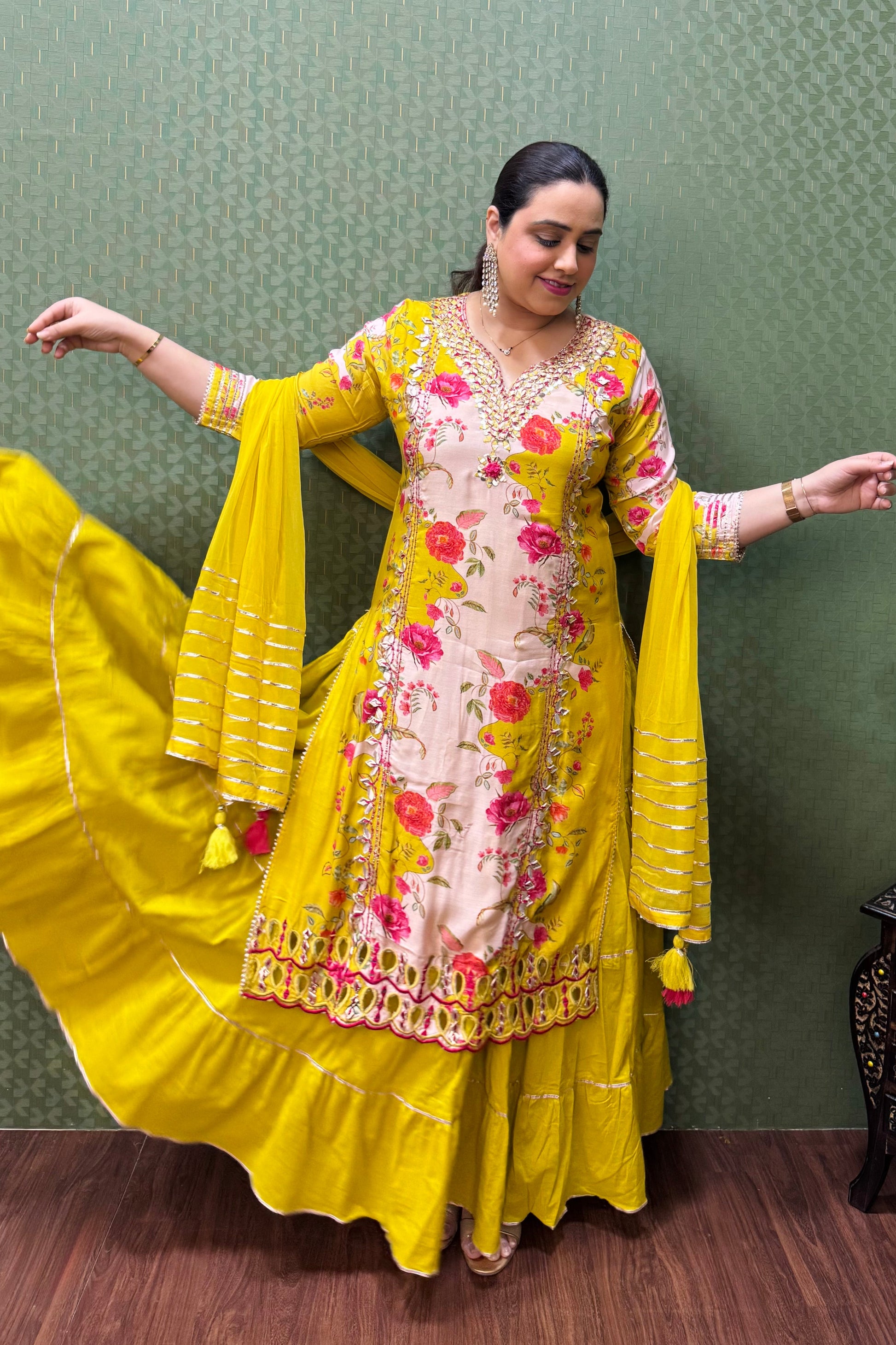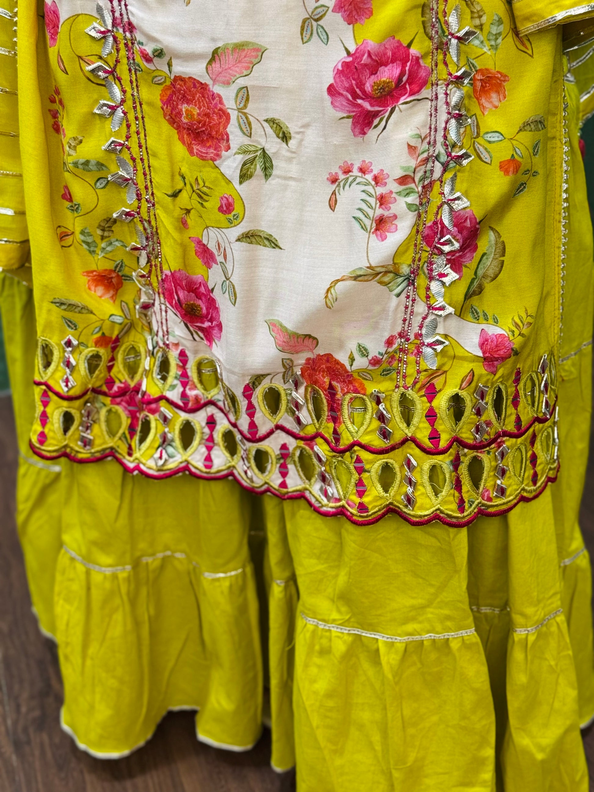 Make a graceful statement with this stunning Pure Muslin One-Piece Gown, crafted to perfection for a blend of tradition and elegance. The top, made of soft muslin, features intricate detailing of gotta work, showcasing exquisite craftsmanship. The bottom skirt, crafted from luxurious mul cotton, flows beautifully, offering a flattering silhouette. The attached skirt and top create a seamless, elegant look. Completing the ensemble is a lightweight chiffon dupatta, adorned with delicate gotta lace on all four sides, adding a touch of sophistication. Perfect for weddings, festive occasions, or special events.