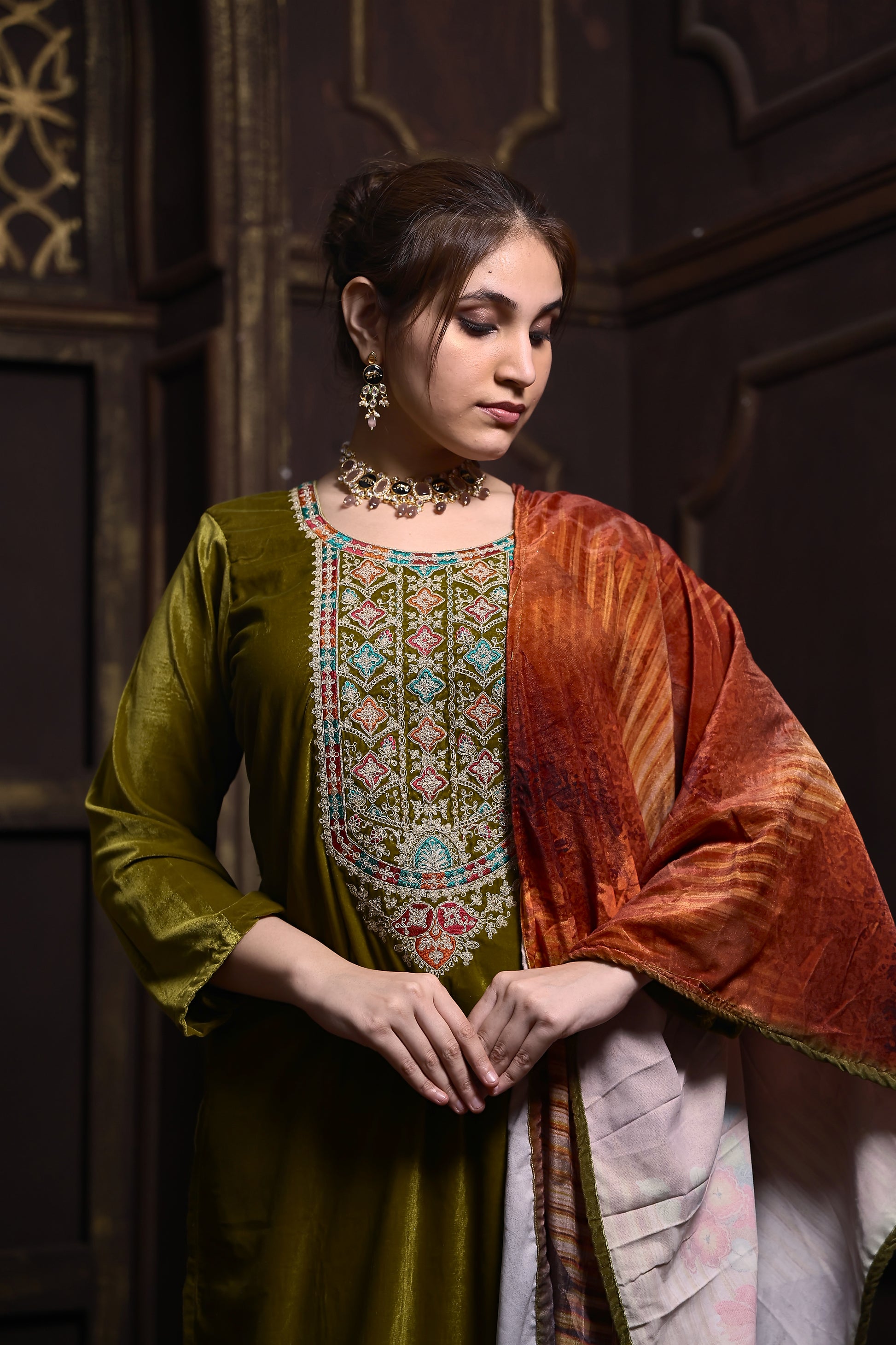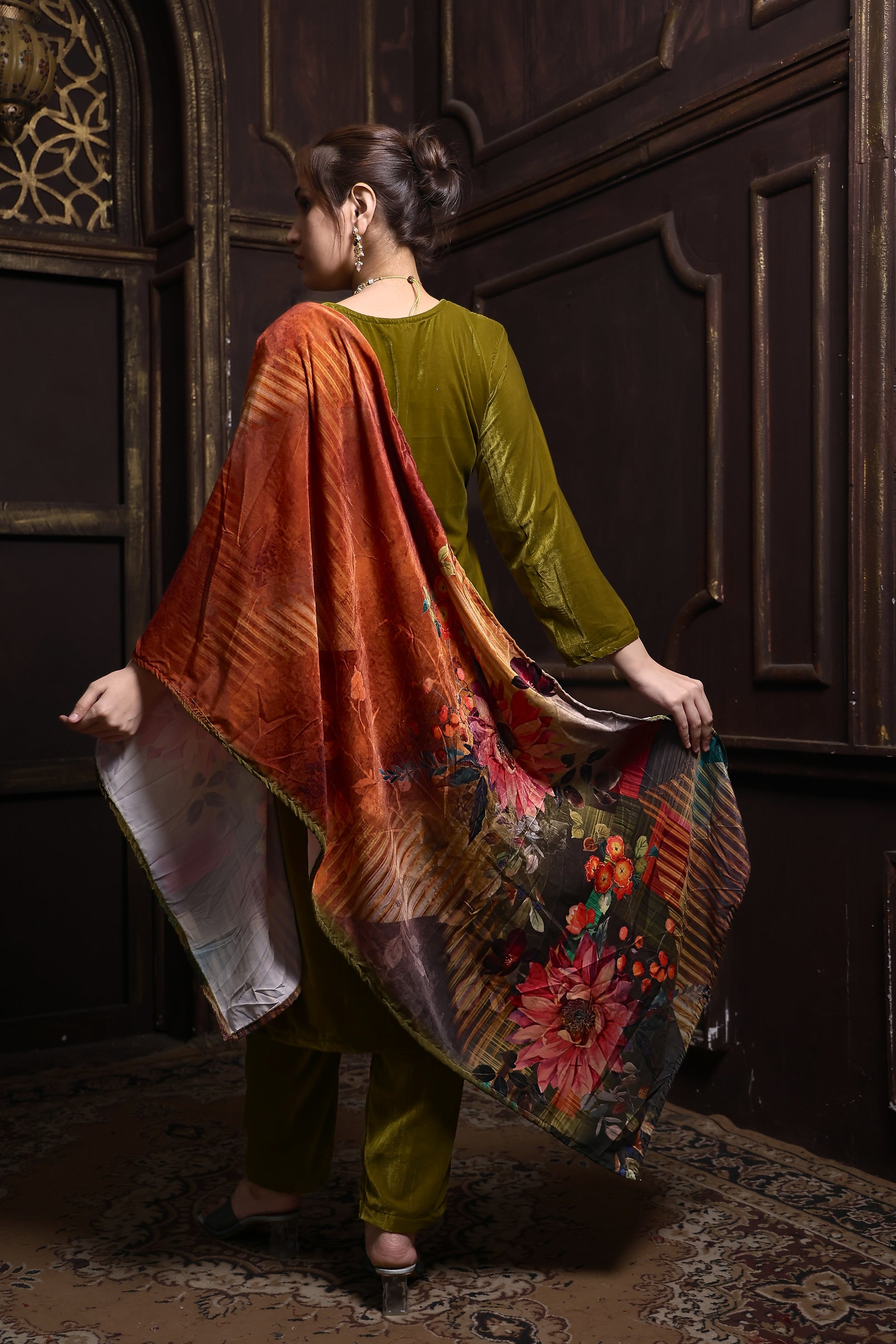 This elegant velvet suit set, perfect for winter and party wear, features a rich velvet top, bottom, and dupatta. The top showcases intricate zari thread work on the yoke, adding a touch of sophistication. The bottom is designed as straight pants for a modern look, and the floral-printed velvet dupatta enhances the ensemble’s luxurious feel.