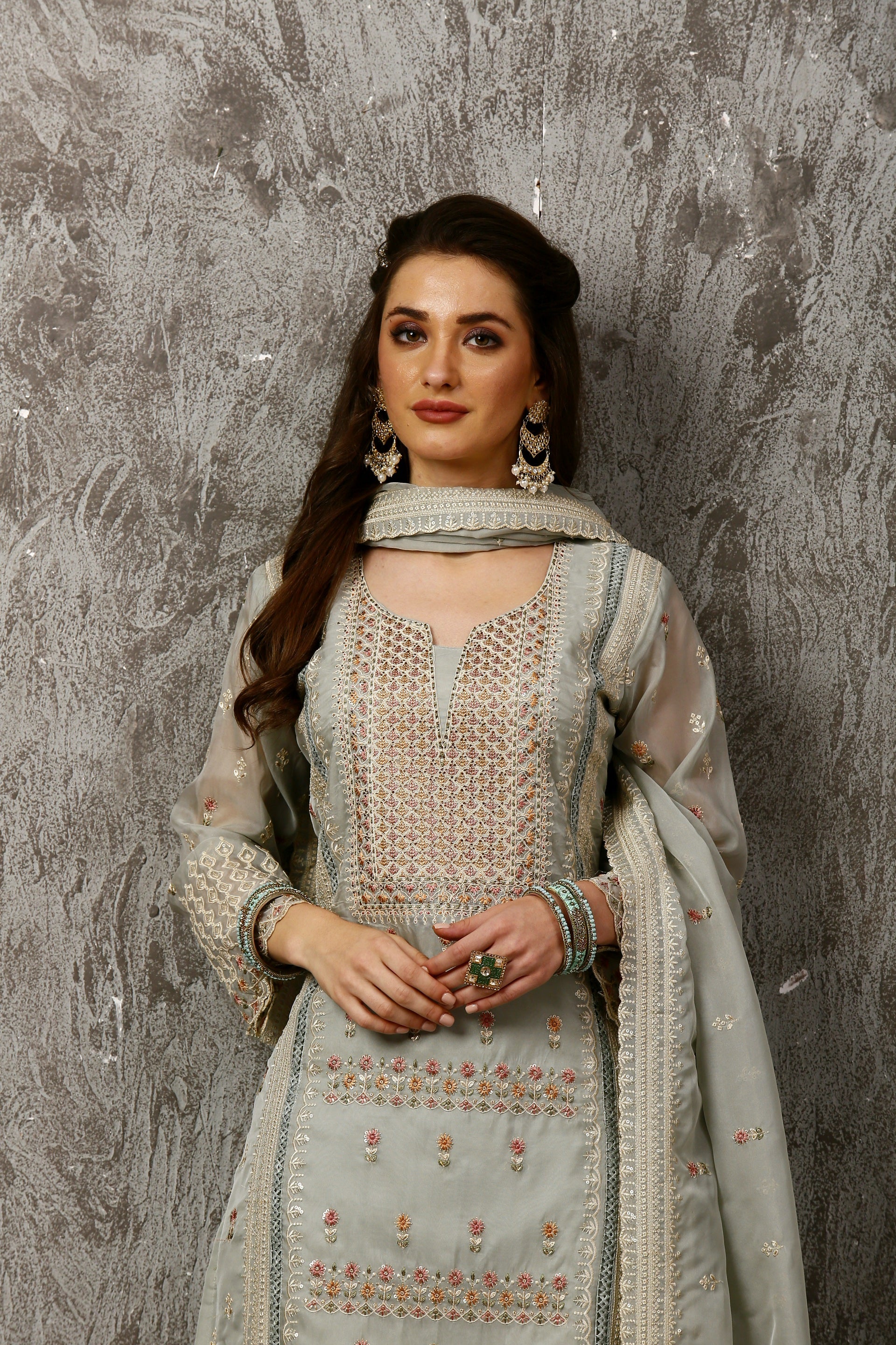 This subtle Pakistani style suit set in pure organza features intricate thread and sequin work on the top and dupatta. Paired with straight pants, both top and bottom are fully lined with butter crepe for comfort, making it perfect for party wear.