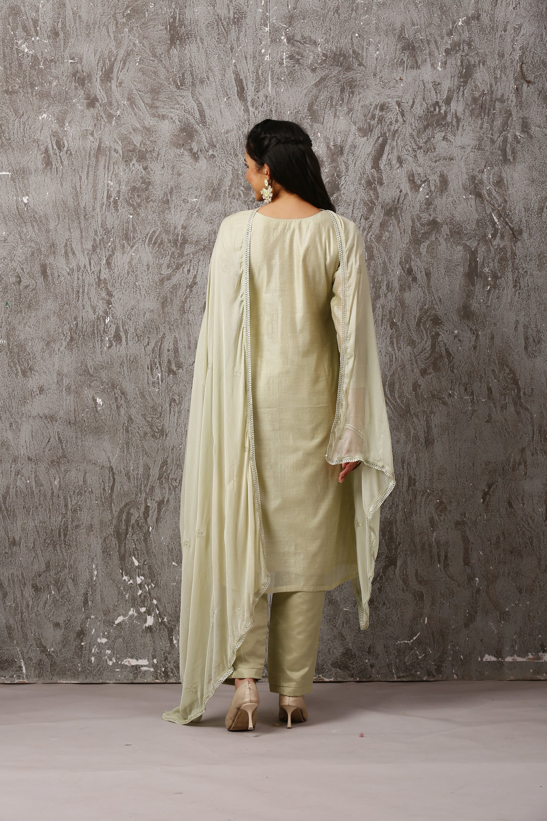 This elegant Chanderi suit set features floral thread and sequin embroidery on the top, paired with straight-cut pants for a modern look. The chiffon dupatta is adorned with crochet lace on all sides and delicate floral embroidery, making it perfect for festive occasions and parties.