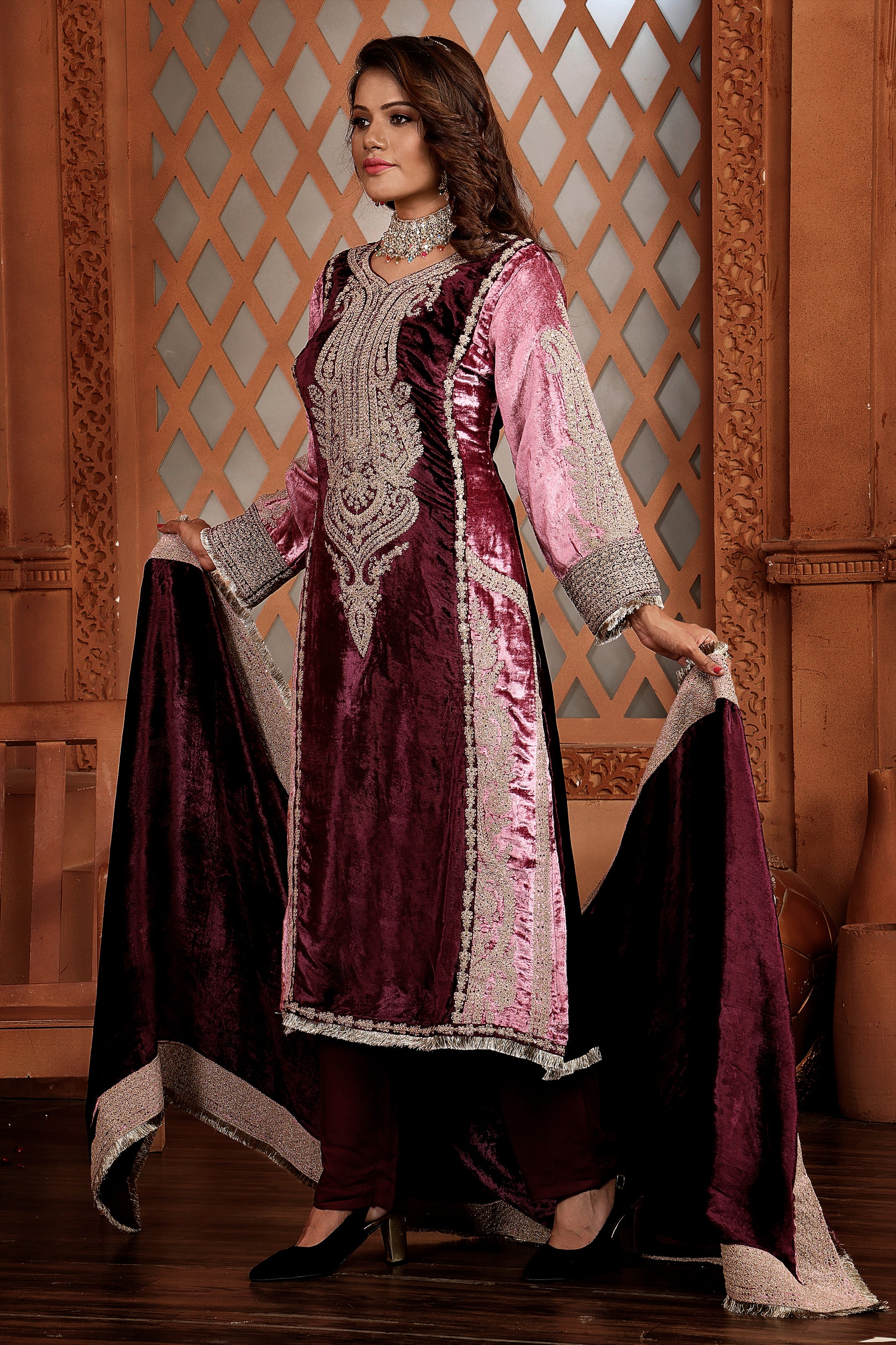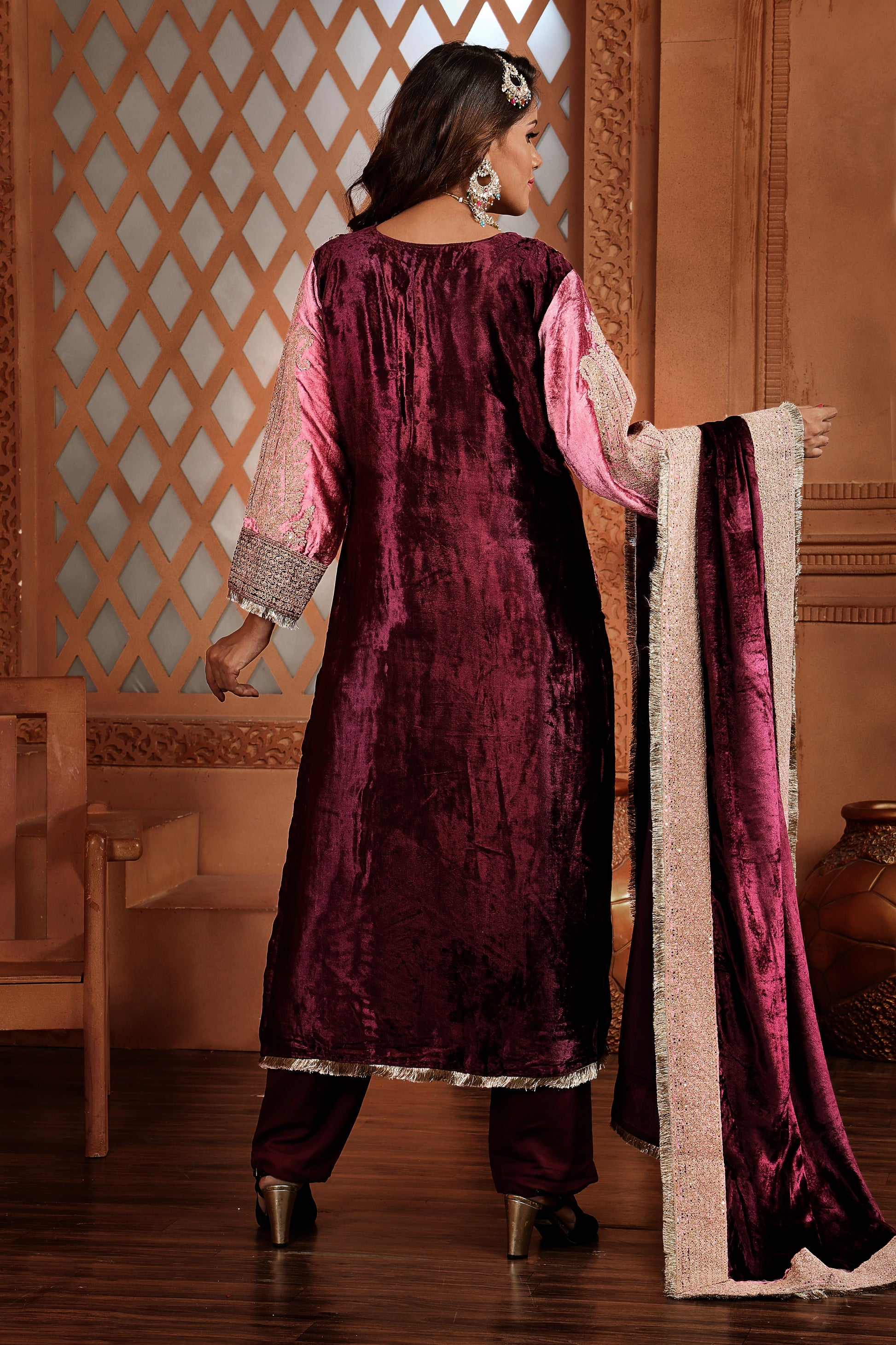 This velvet suit is made of pure Sicilian silky velvet top with stunning contrast in shirt, features exquisite minawork and embroidery on the daman and sleeves, adding a touch of elegance and sophistication. Luxurious and stylish, it's an ideal choice for festive occasions.
