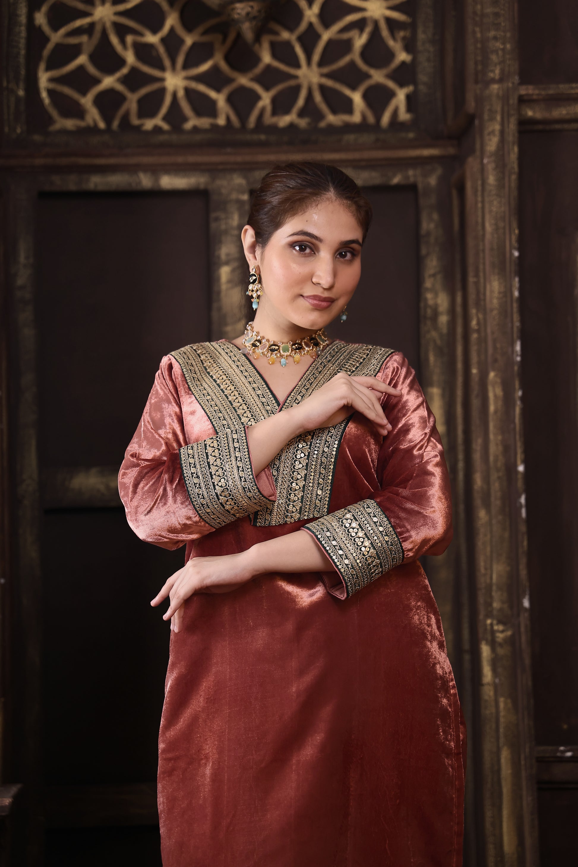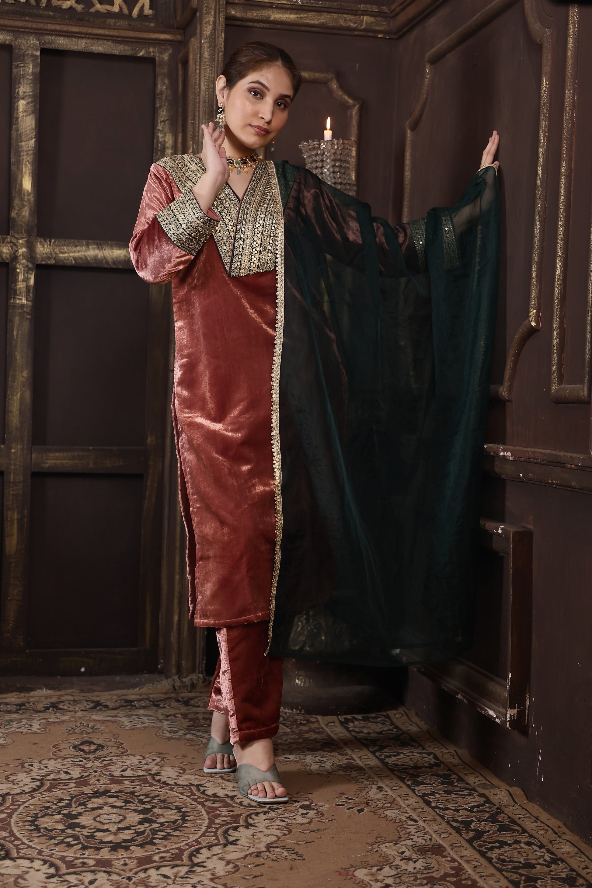 A refined ice velvet suit set featuring a straight ice velvet pant and top with lace detailing on the neckline & Sleeves. The set is completed with an organza dupatta, elegantly lined with lace on its two longer sides. Perfect for special occasions.