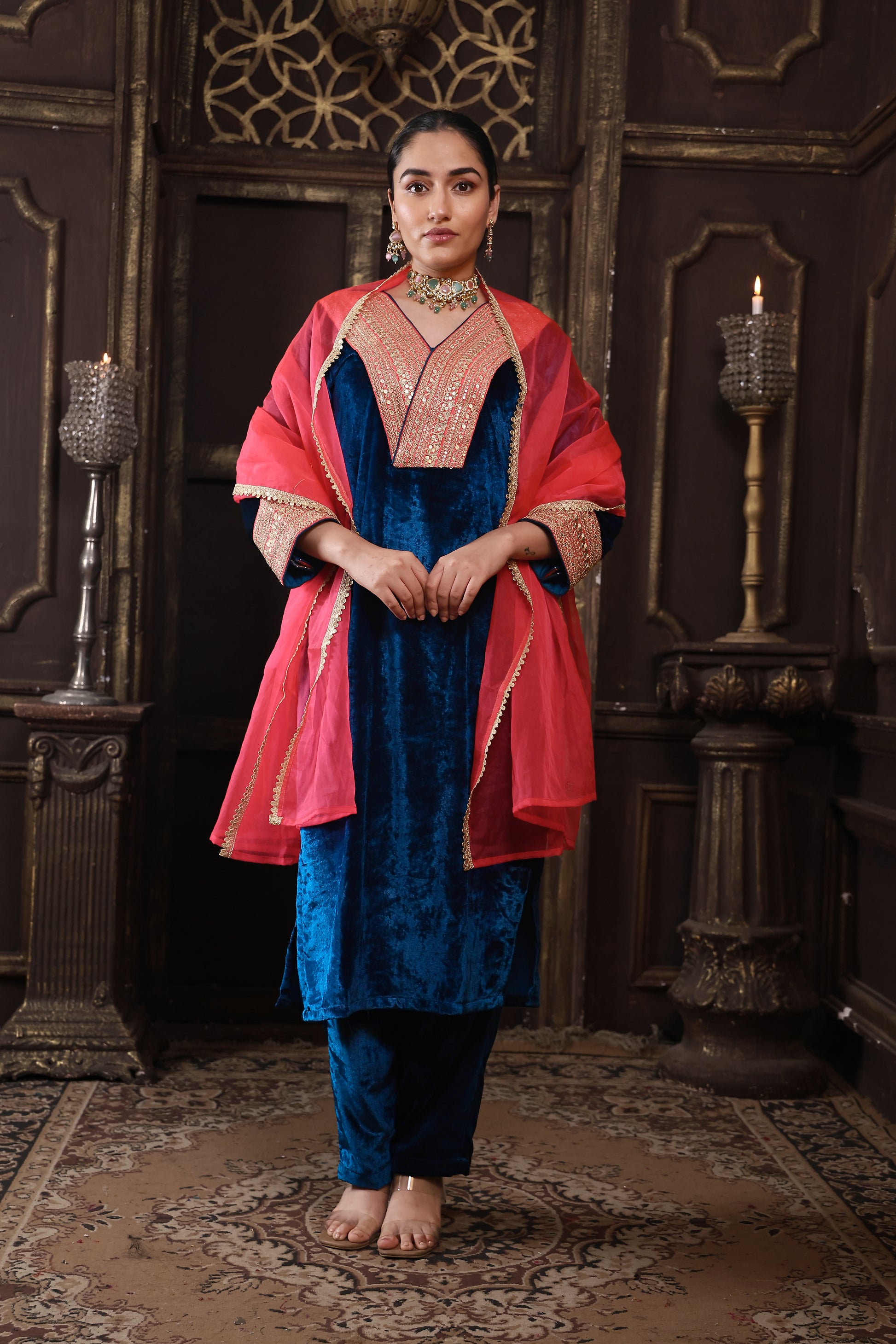 A refined ice velvet suit set featuring a straight ice velvet pant and top with lace detailing on the neckline & sleeves. The set is completed with an organza dupatta, elegantly lined with lace on its two longer sides. Perfect for special occasions.