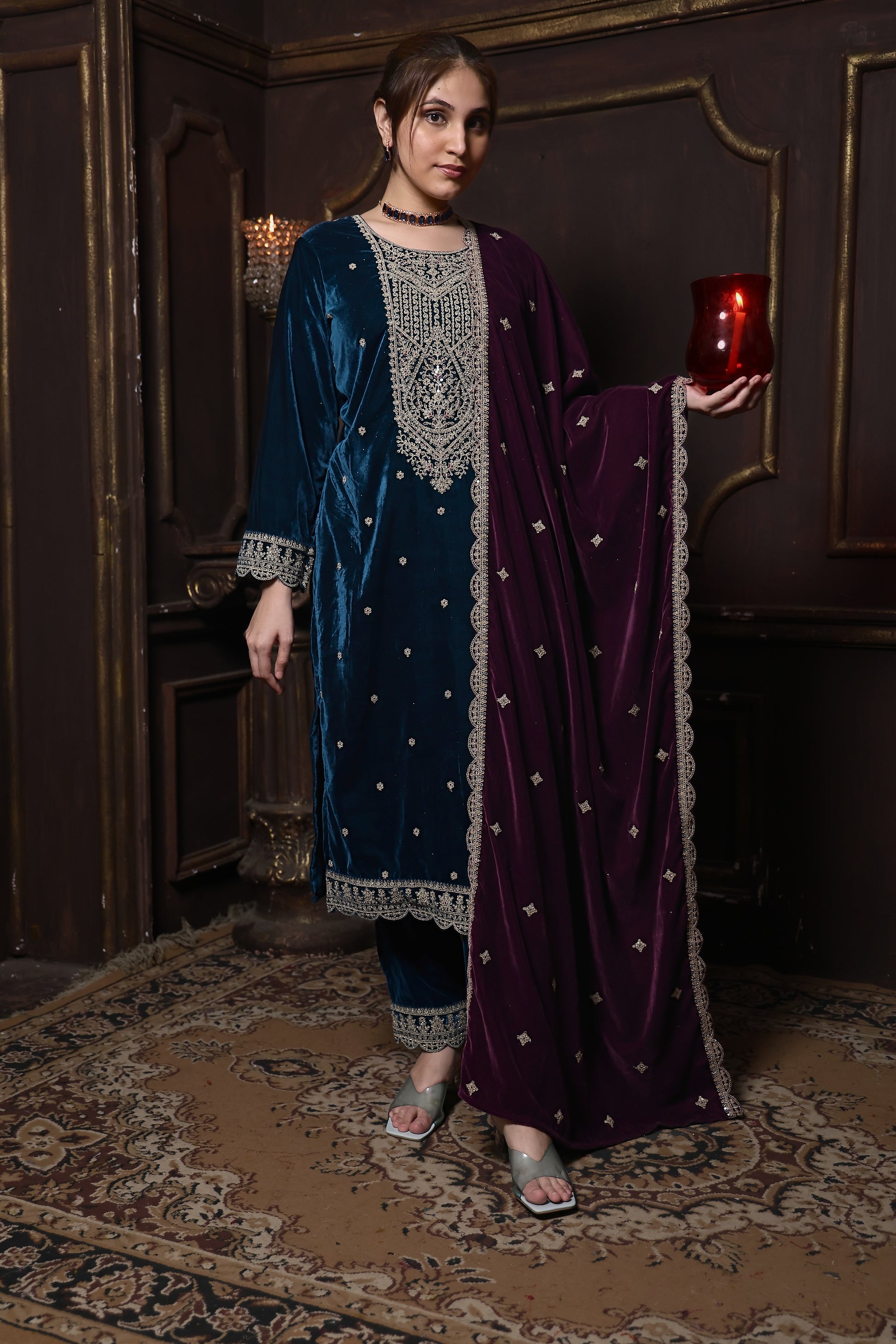 A luxurious velvet suit set ideal for parties, featuring intricate zari embroidery on the top, daman, and pant hem. The velvet dupatta, with all-over zari embroidery, adds a rich, cohesive elegance to the ensemble.