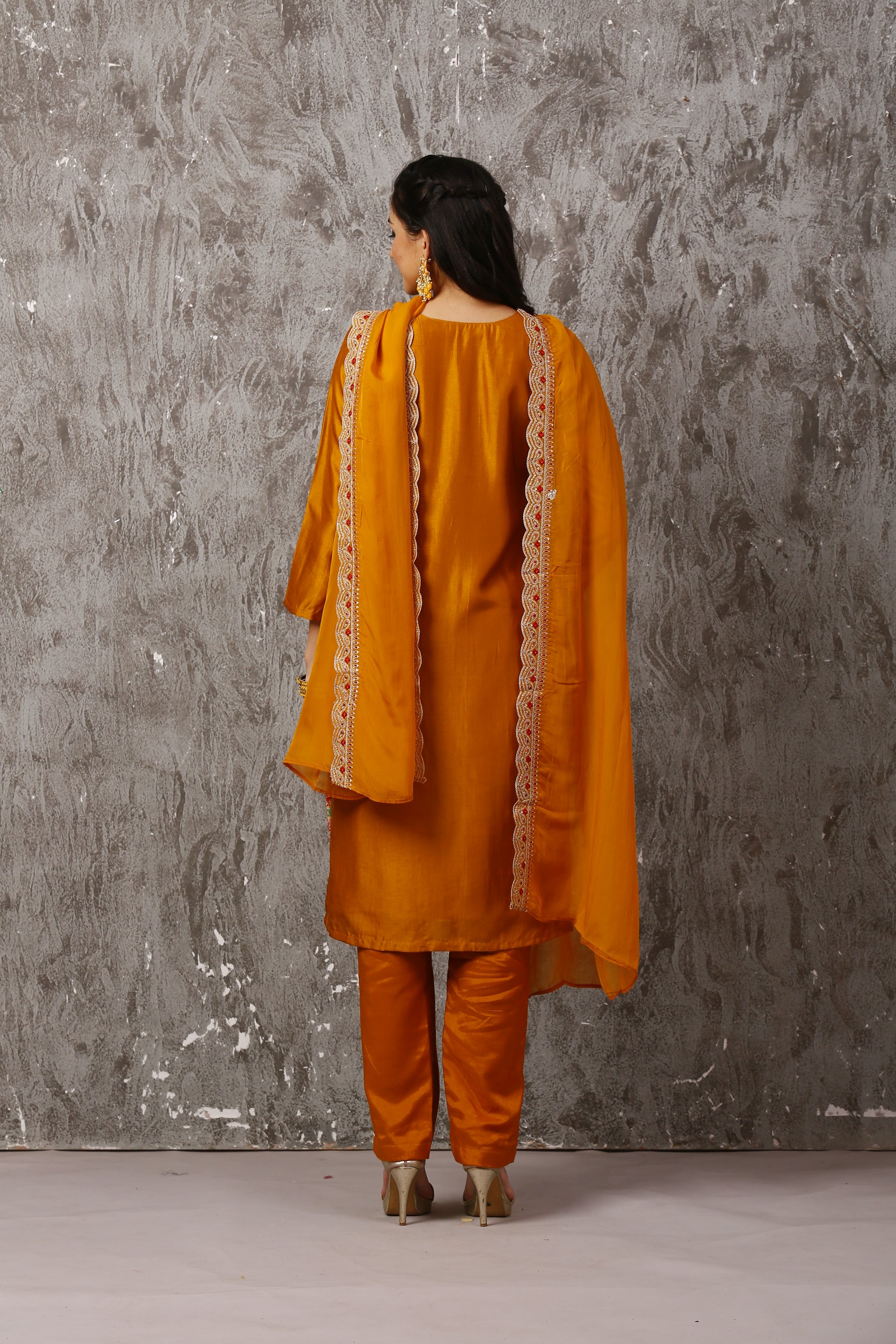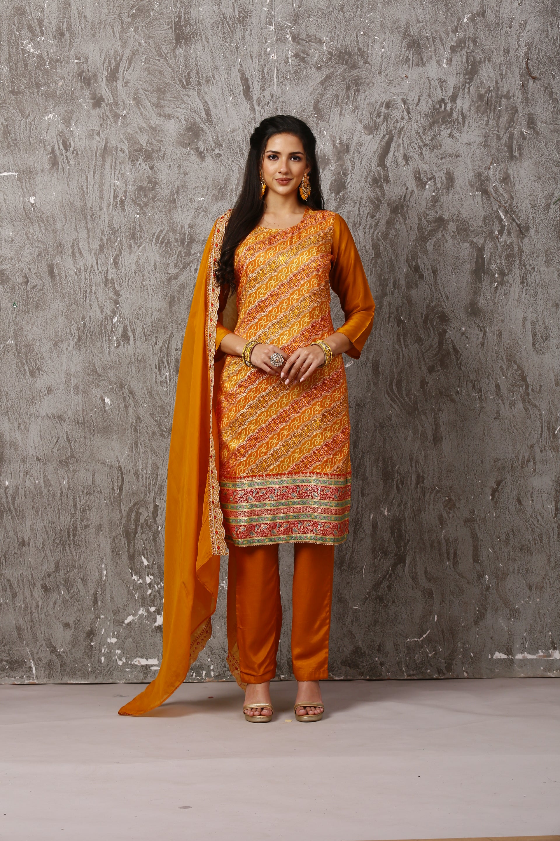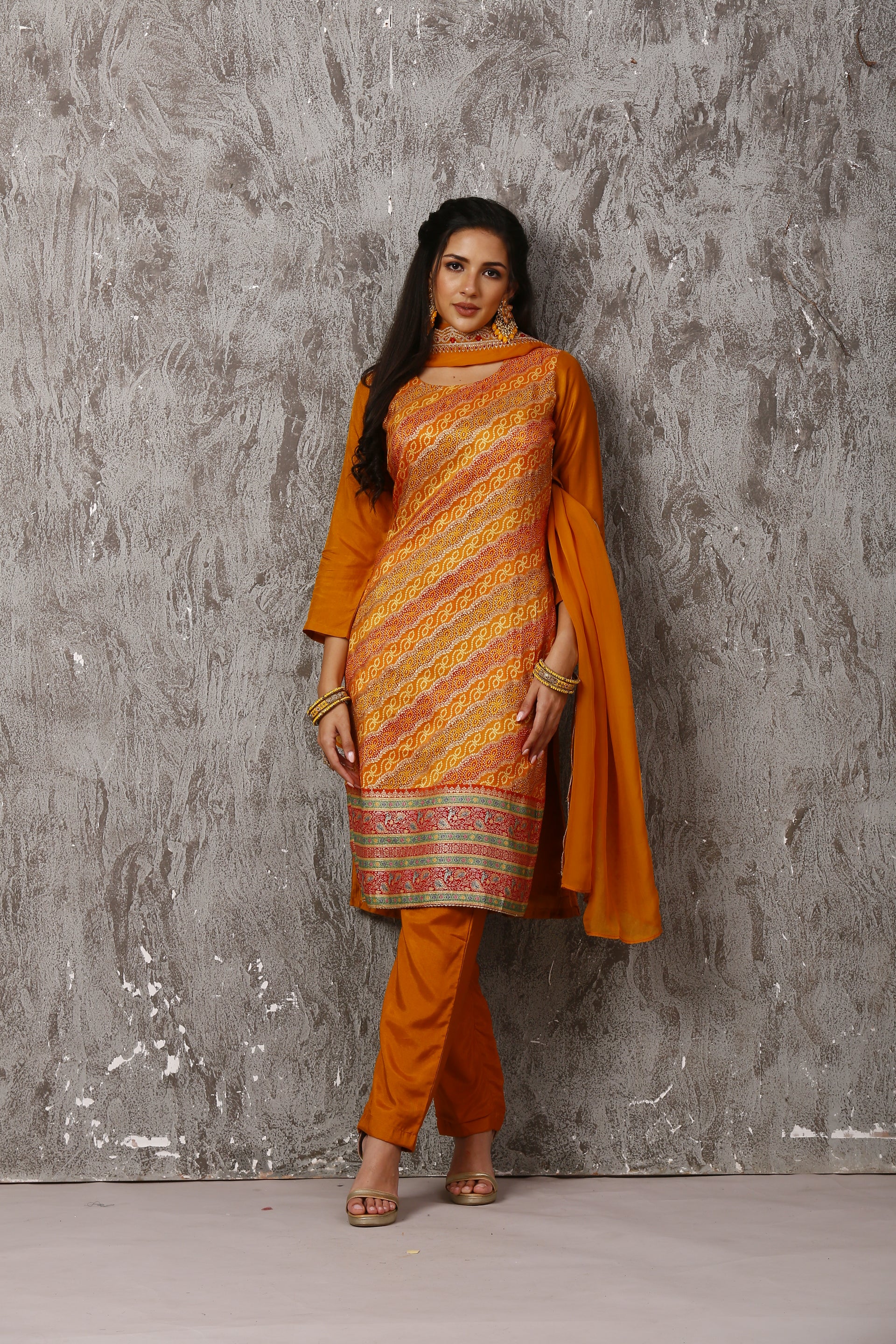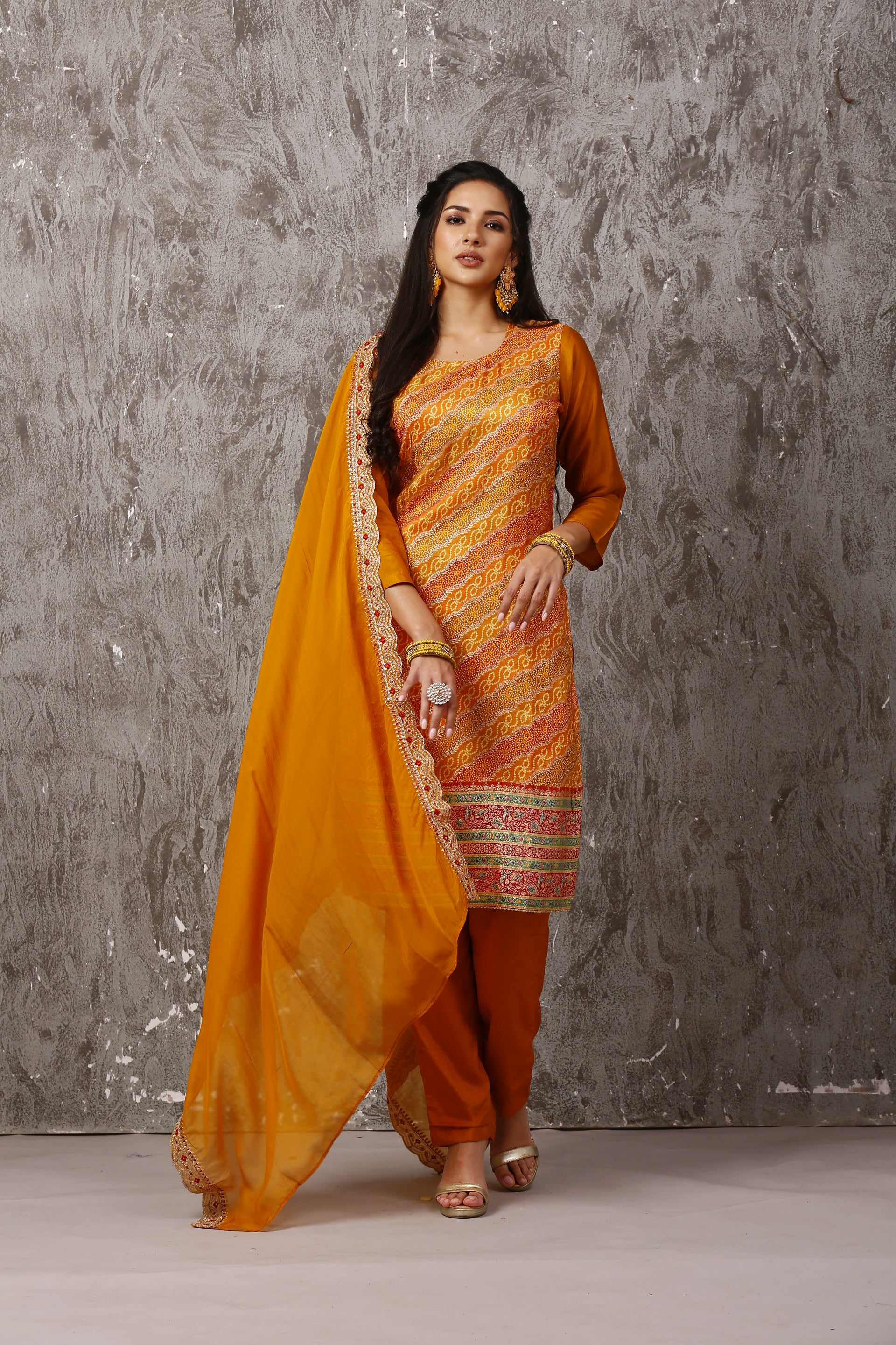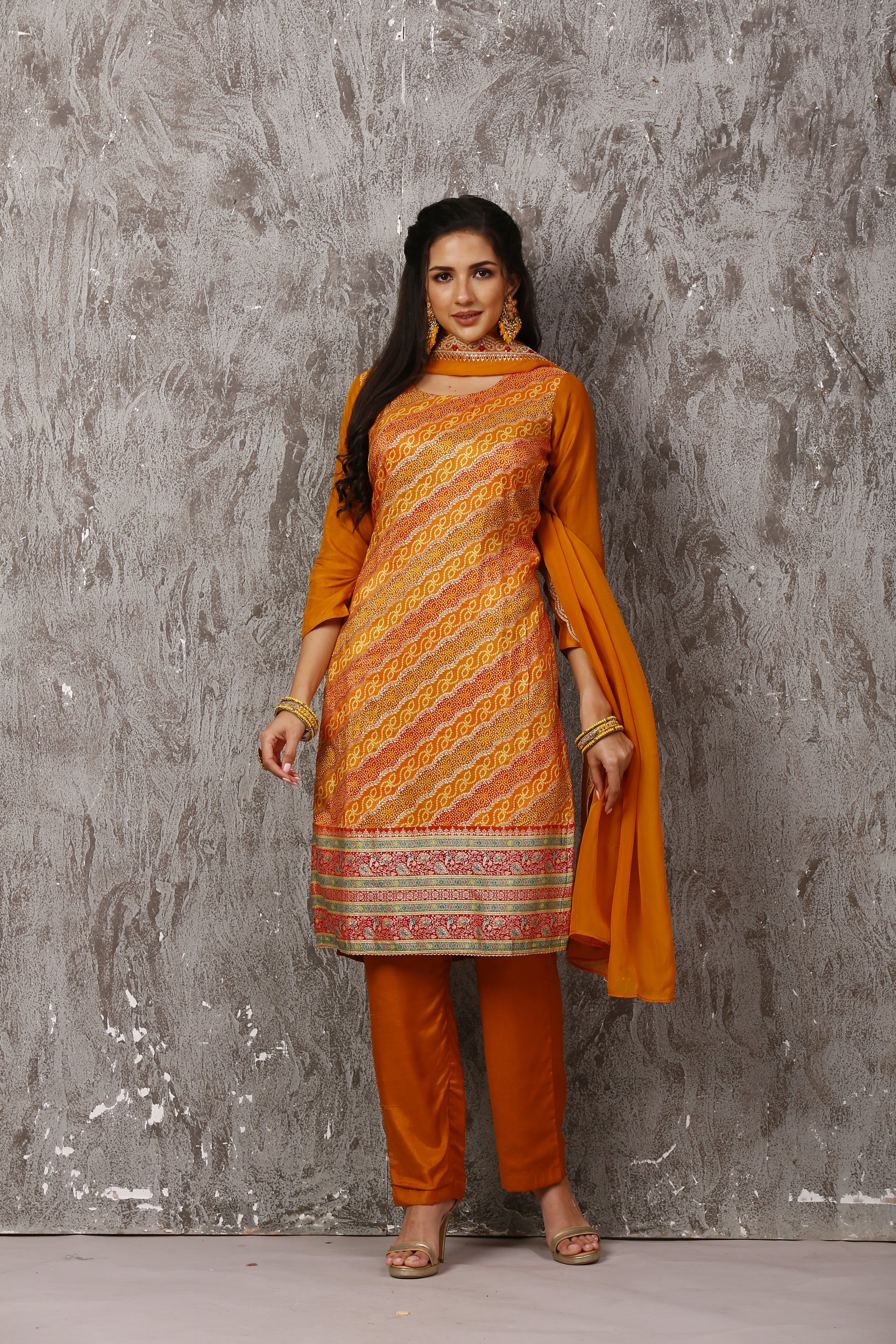 Mustard Jacquard Bandhani Silk Suit Set with Organza Dupatta #1650