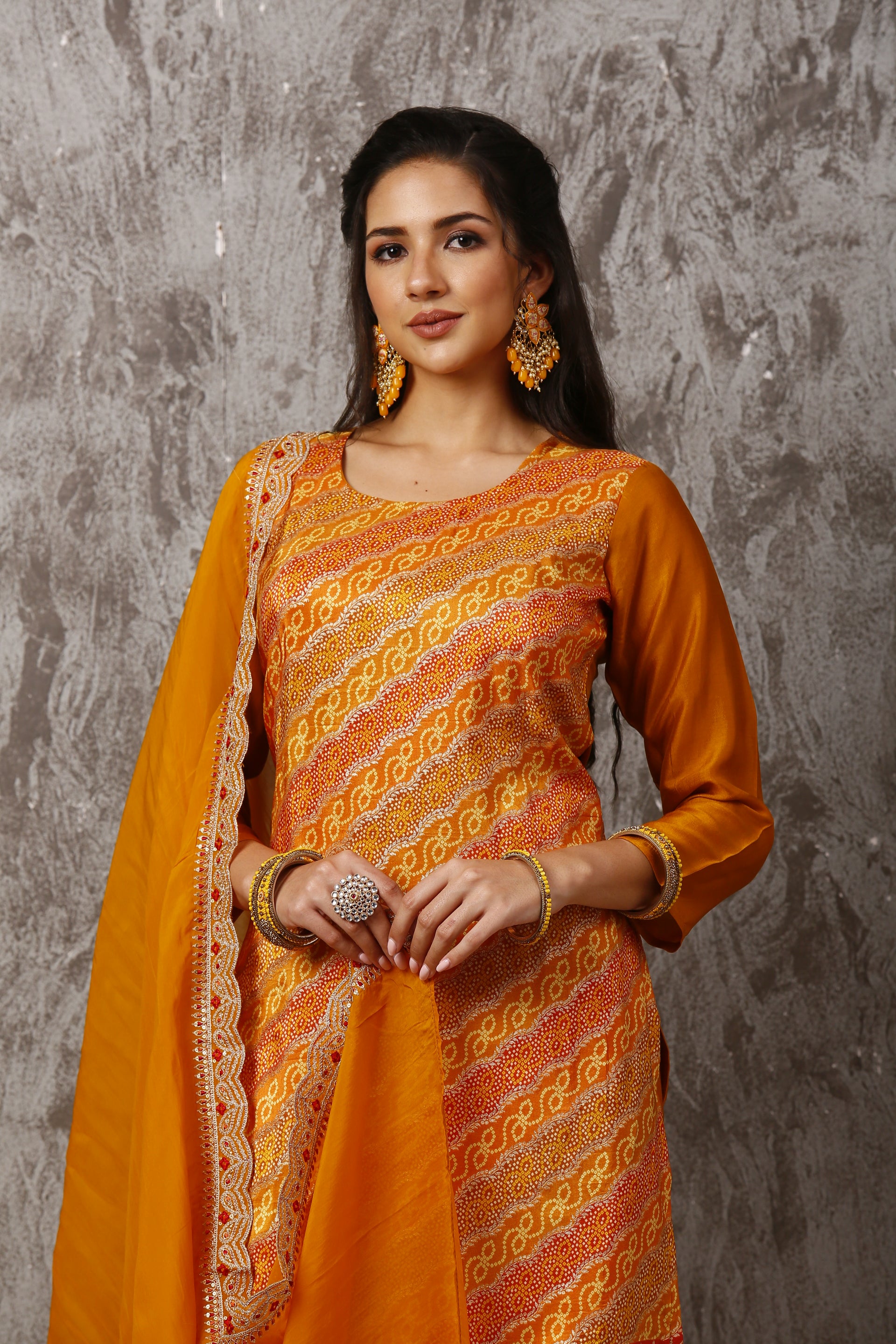 This Russian Silk Jacquard Bandhani suit set features Bandhani print and Jacquard work. Paired with shantoon straight pants and a pure organza dupatta, adorned with thread and sequence work on the borders. Ideal for festive occasions.
